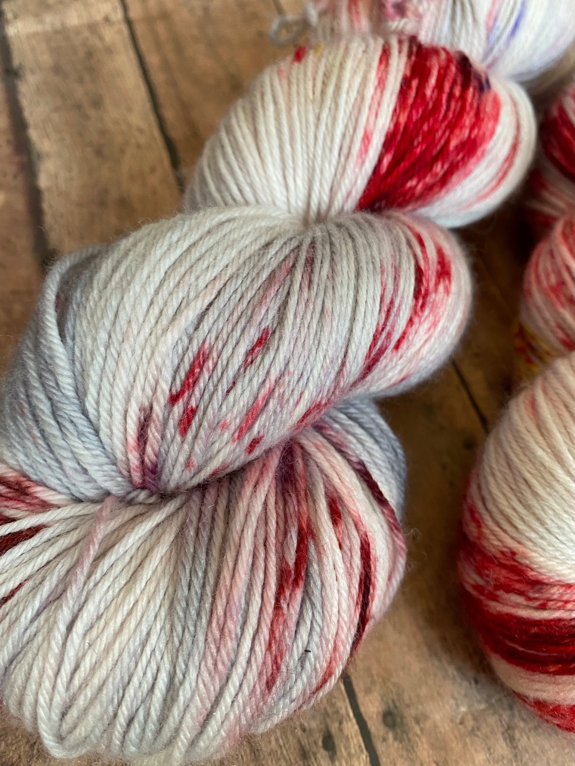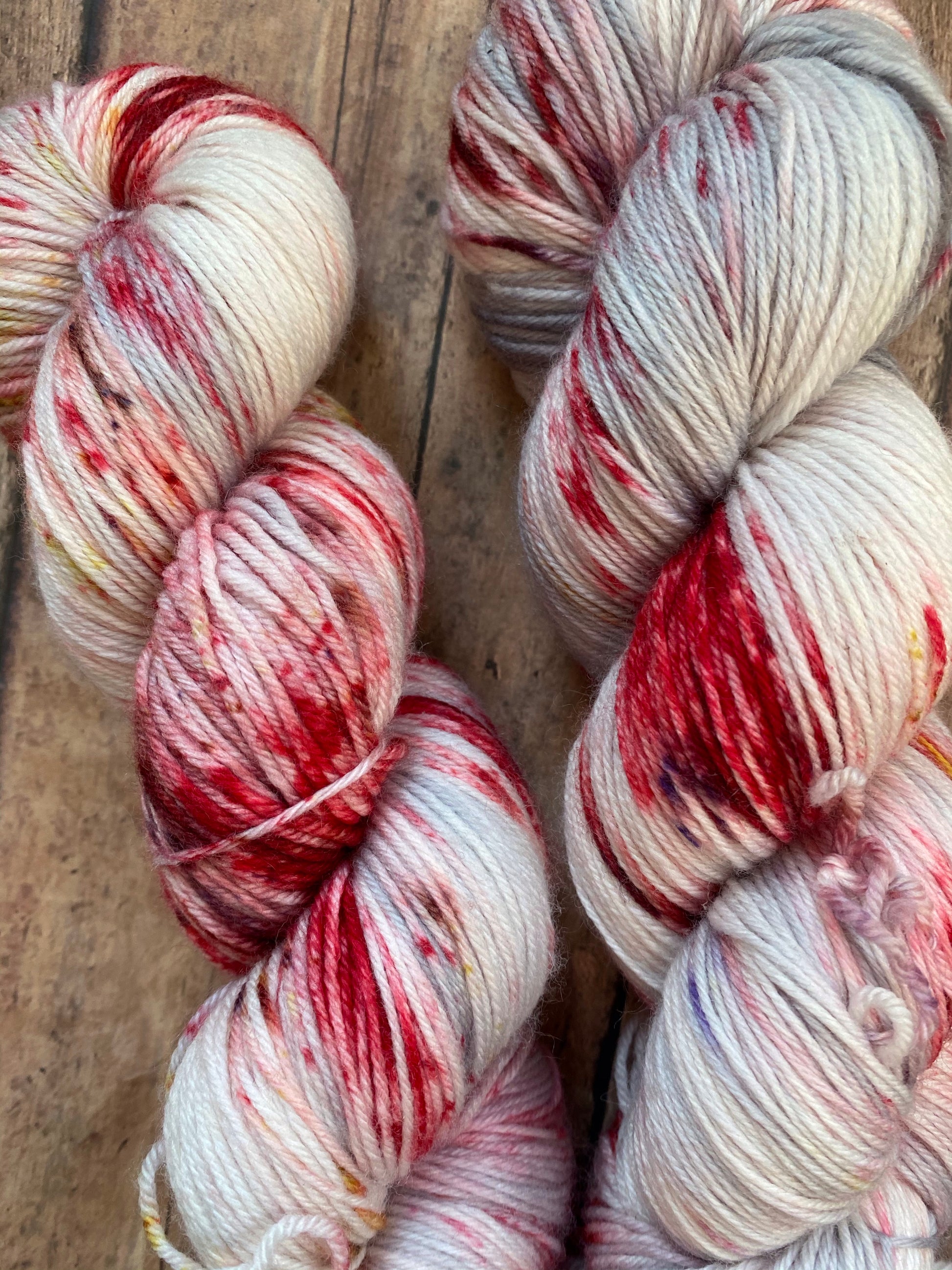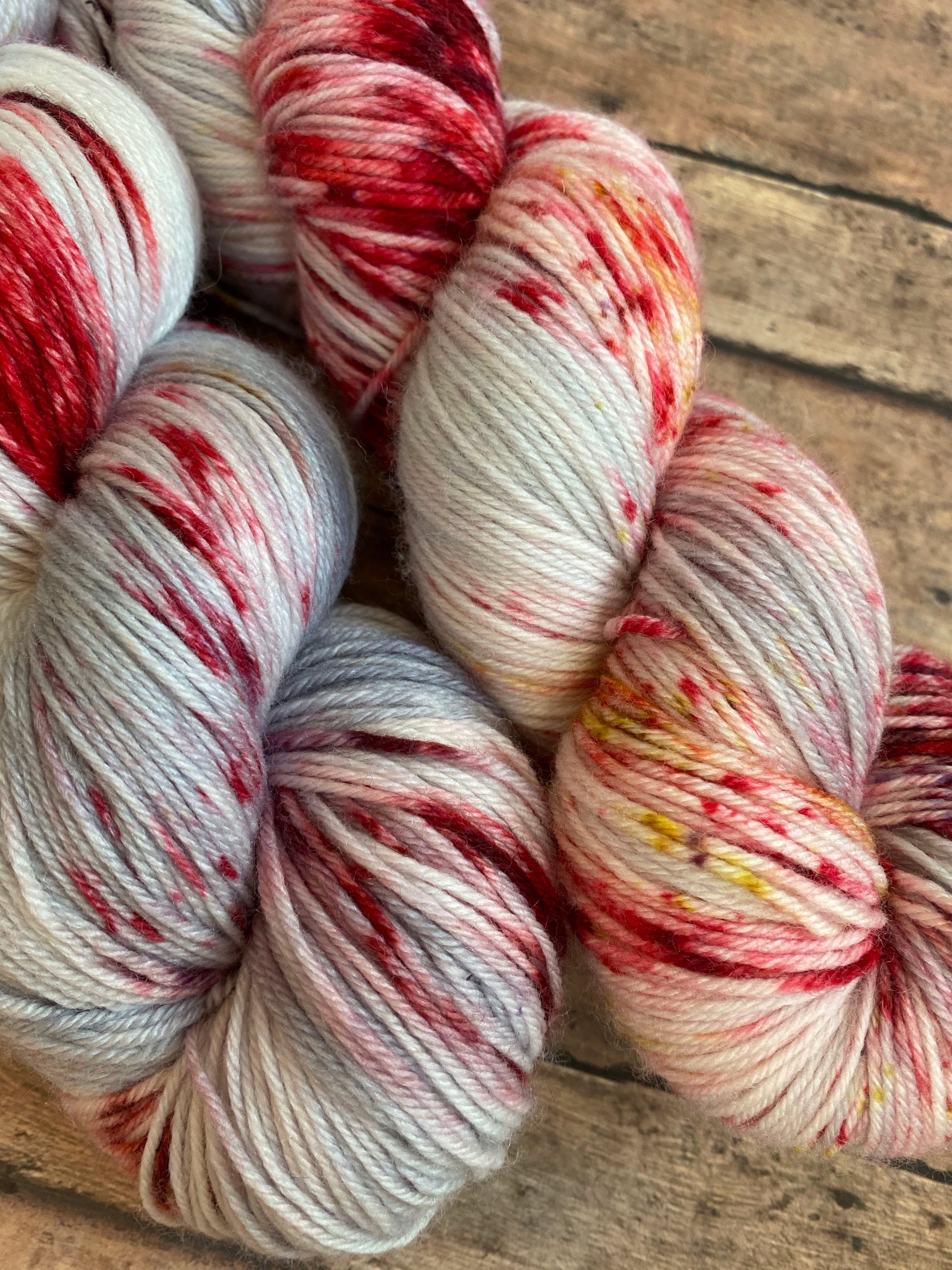 Amadeus is hand dyed yarn on the base of your choosing. Dyed silver grey and speckled red, treveri(wine color), and gold.