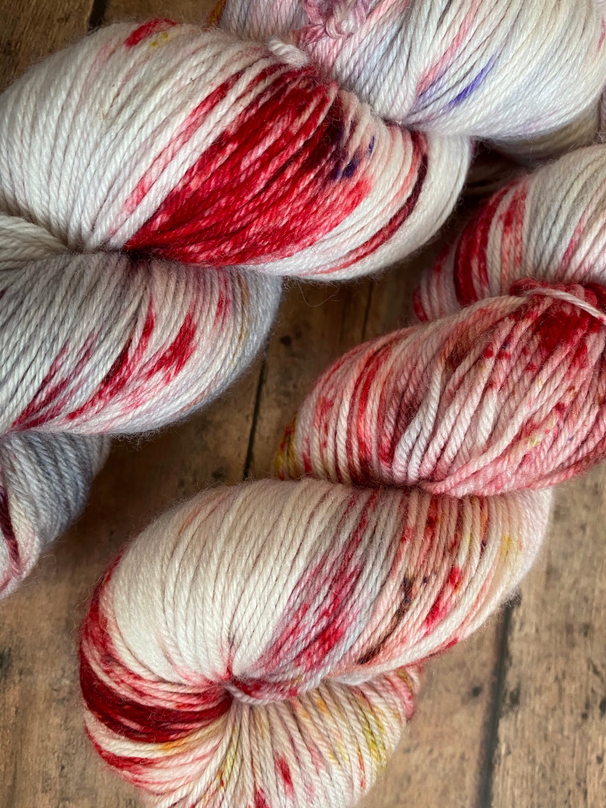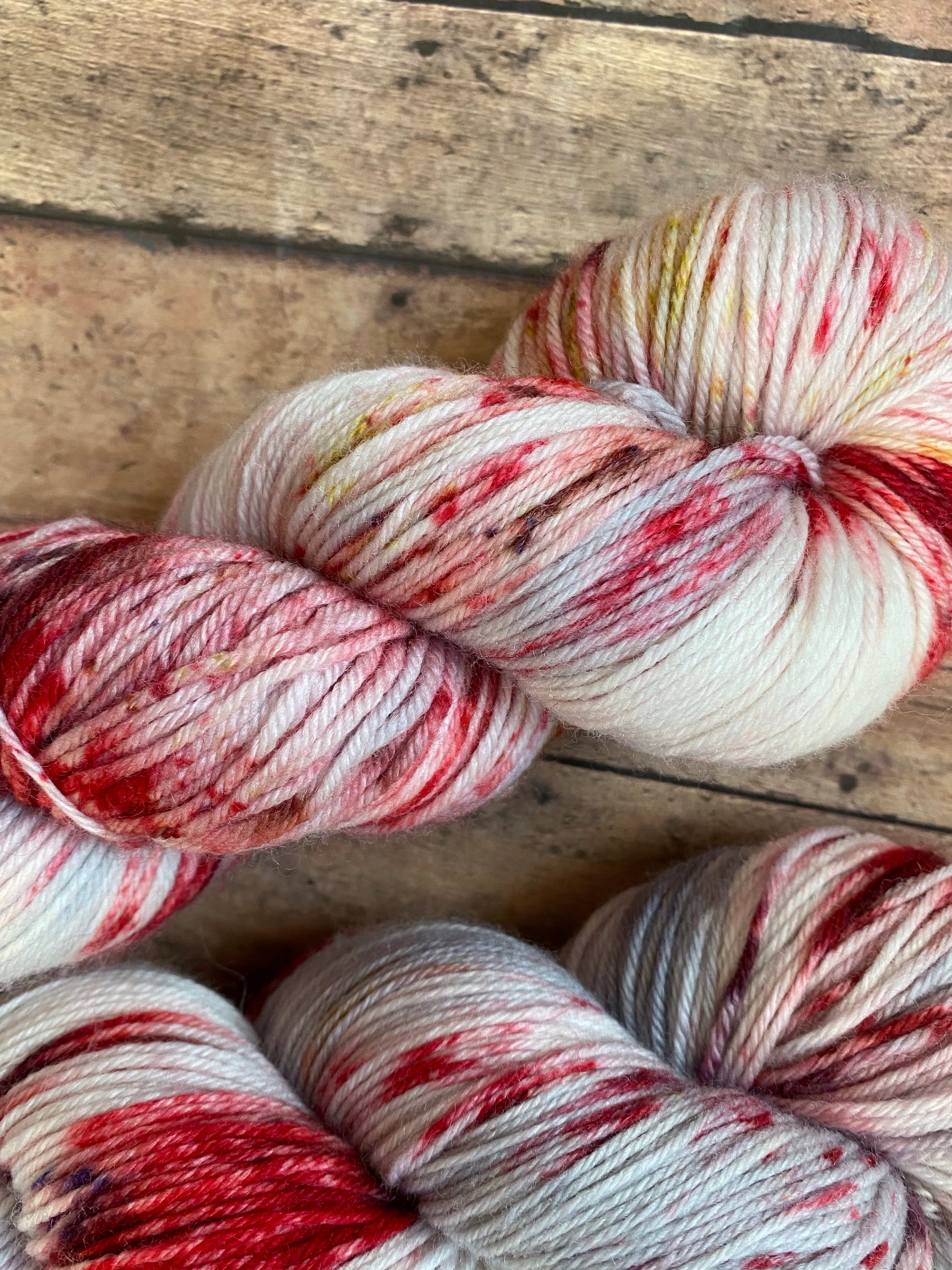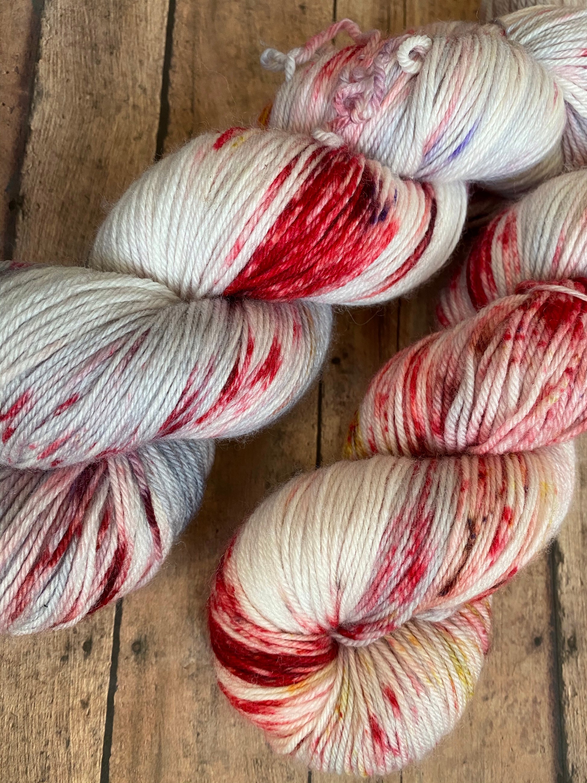 Amadeus is hand dyed yarn on the base of your choosing. Dyed silver grey and speckled red, treveri(wine color), and gold.