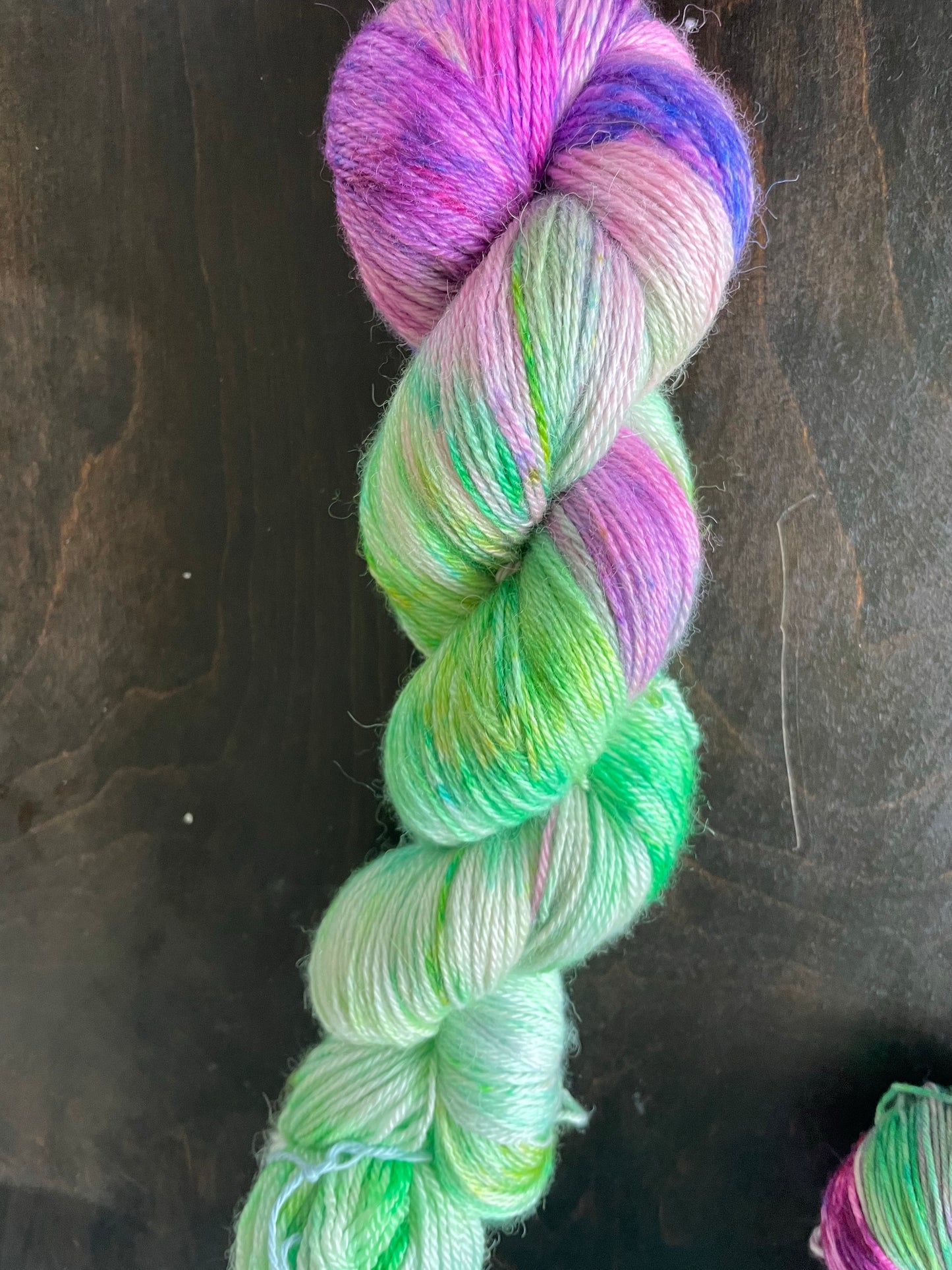Deja Vu is dyed with a pale blue base and a speckling of greens and purple.