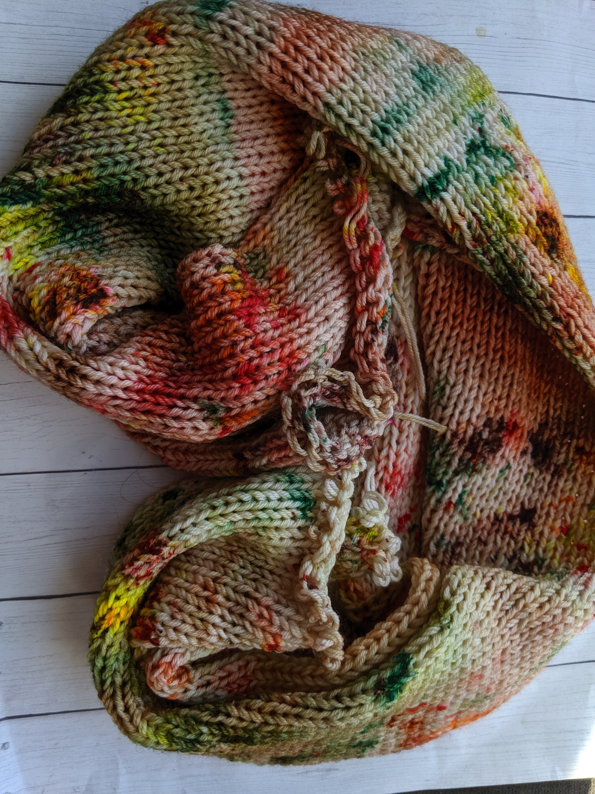 Leaf Jumping is a hand painted double knit sock blank. Perfect for two at a time sock knitting. This is dyed with various greens, gold, red, and orange.