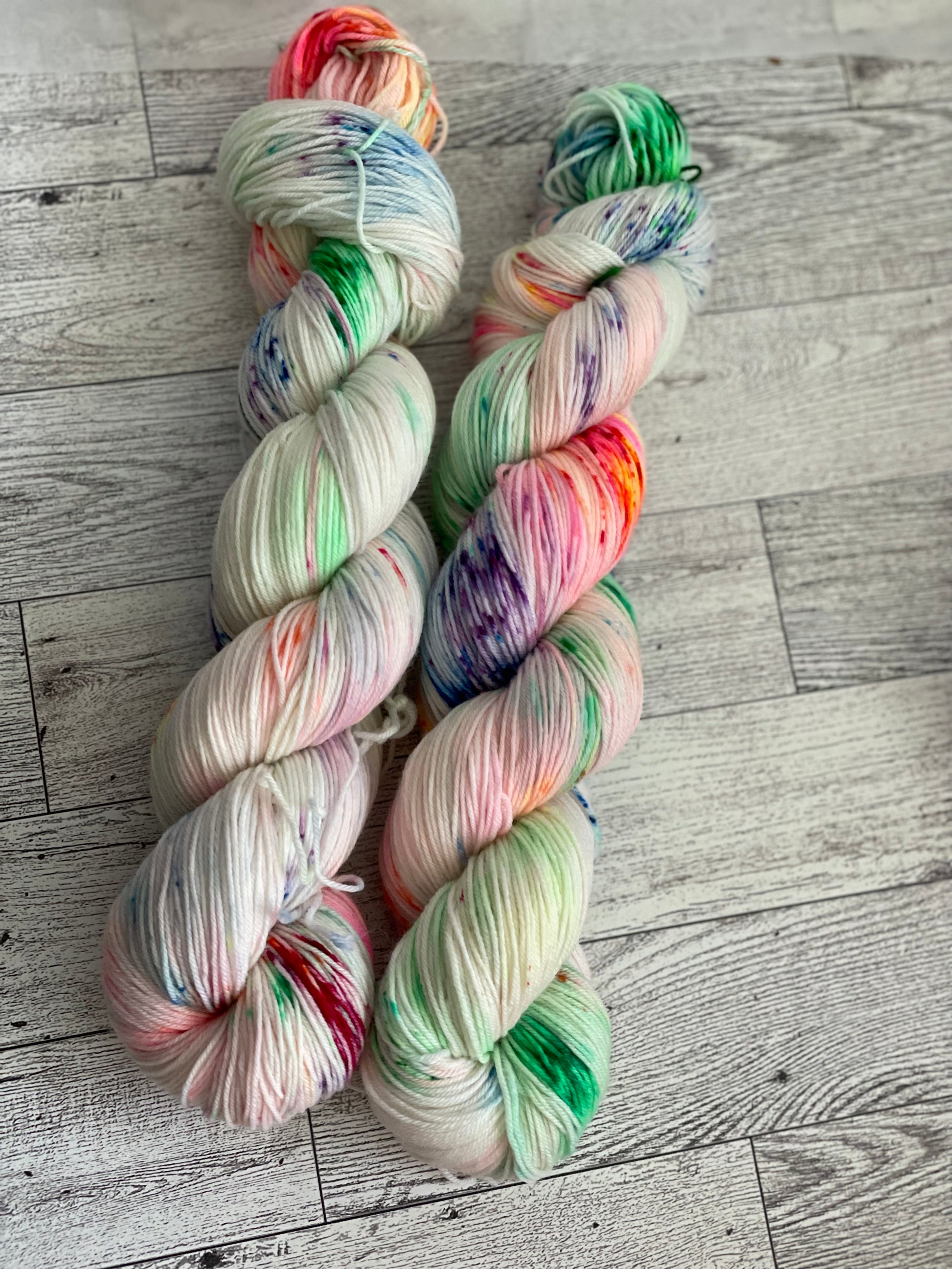 Funfetti Cupcake yarn is your zero calorie alternative to the delicious cupcake it's named after. It has a rainbow speckling throughout the skeins.