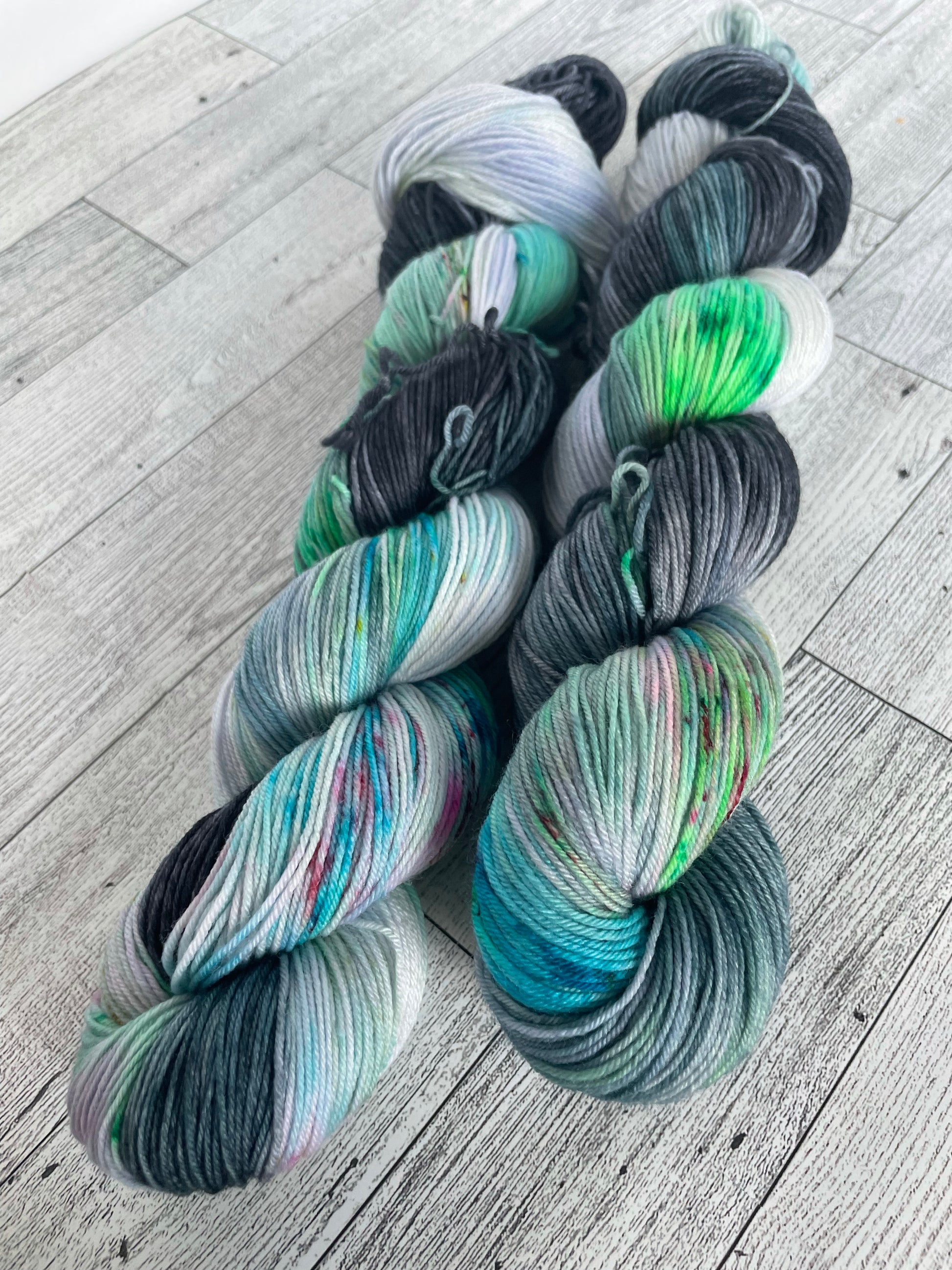 Get Lit is dyed with charcoal grey/black and a pale blueish purple with a speckling of green, red, pink, turquoise and gold.