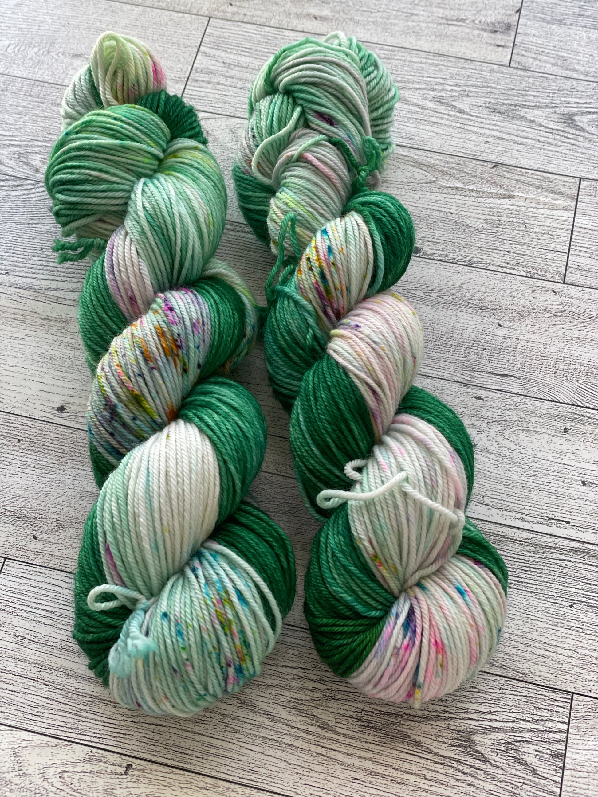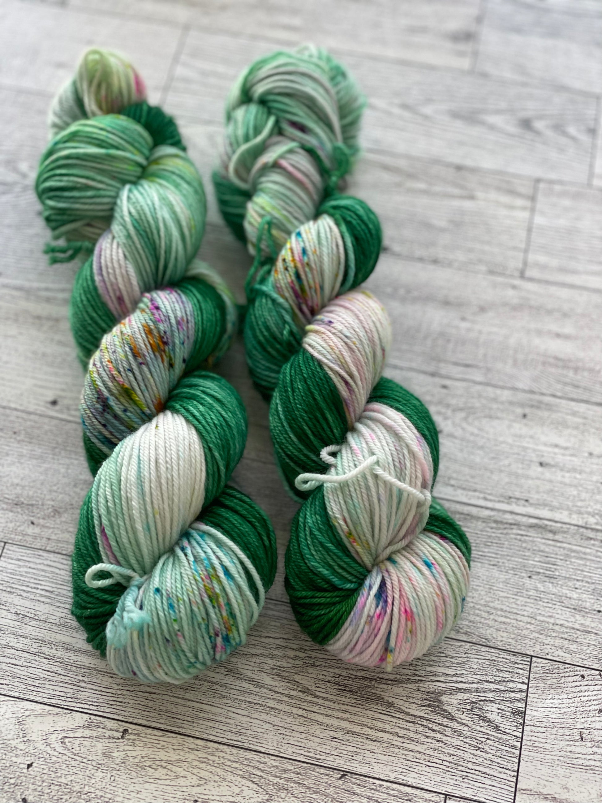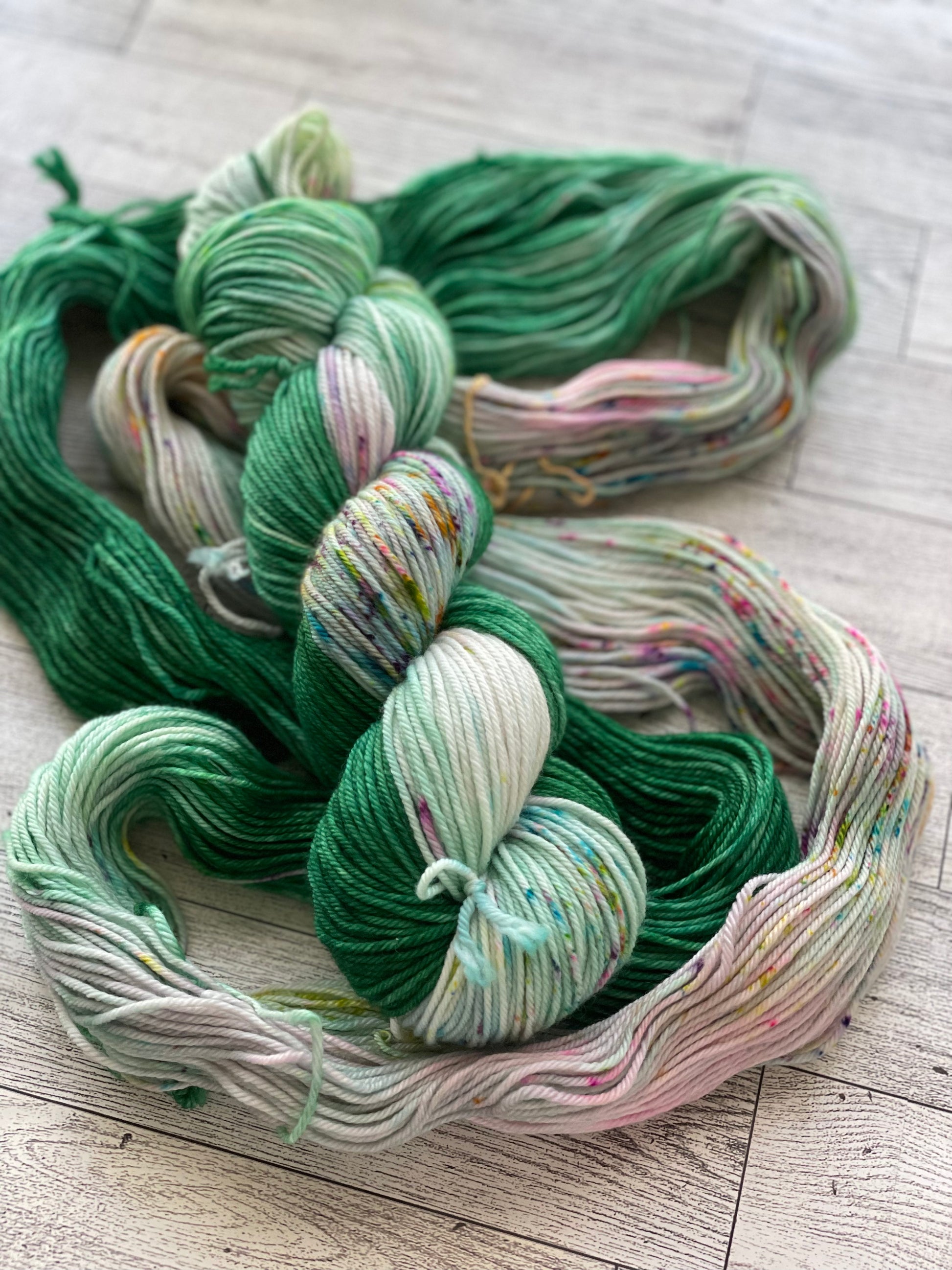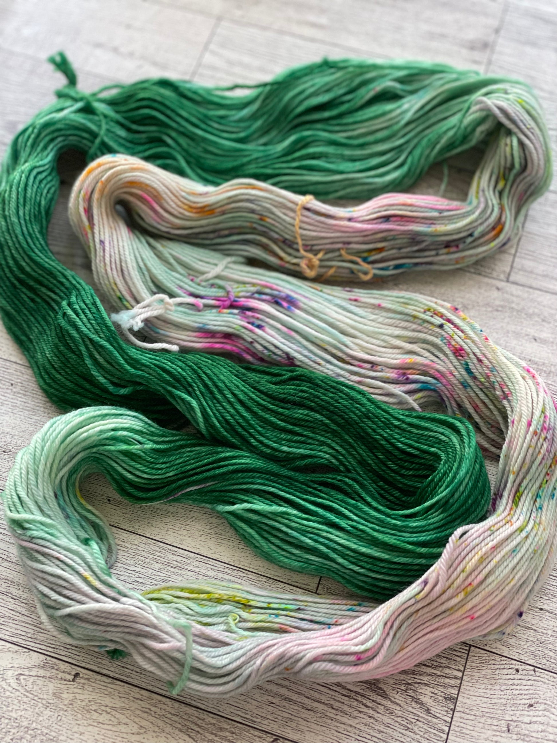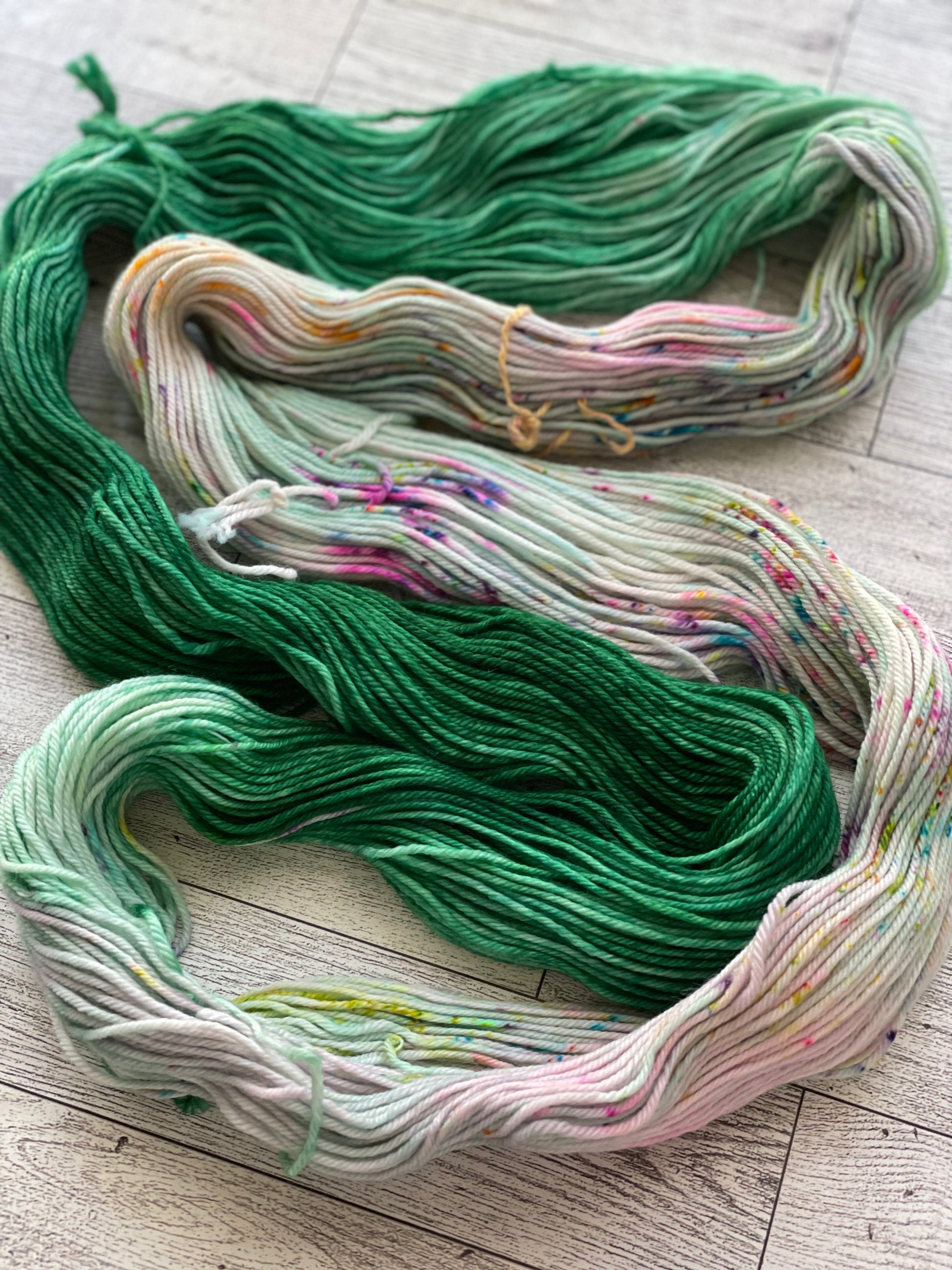 Green Thunder was a request from my youngest son. His favorite color is green. So we have half dyed a deep green and the other half is a pale green with a speckling of hot pink, neon yellow, orange, turquoise and purple.