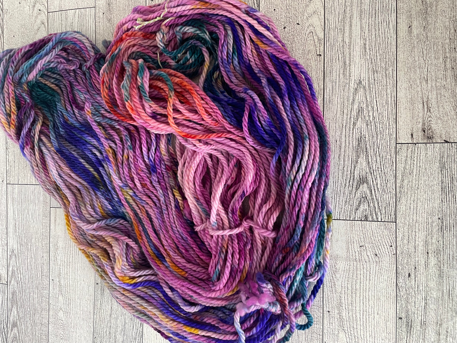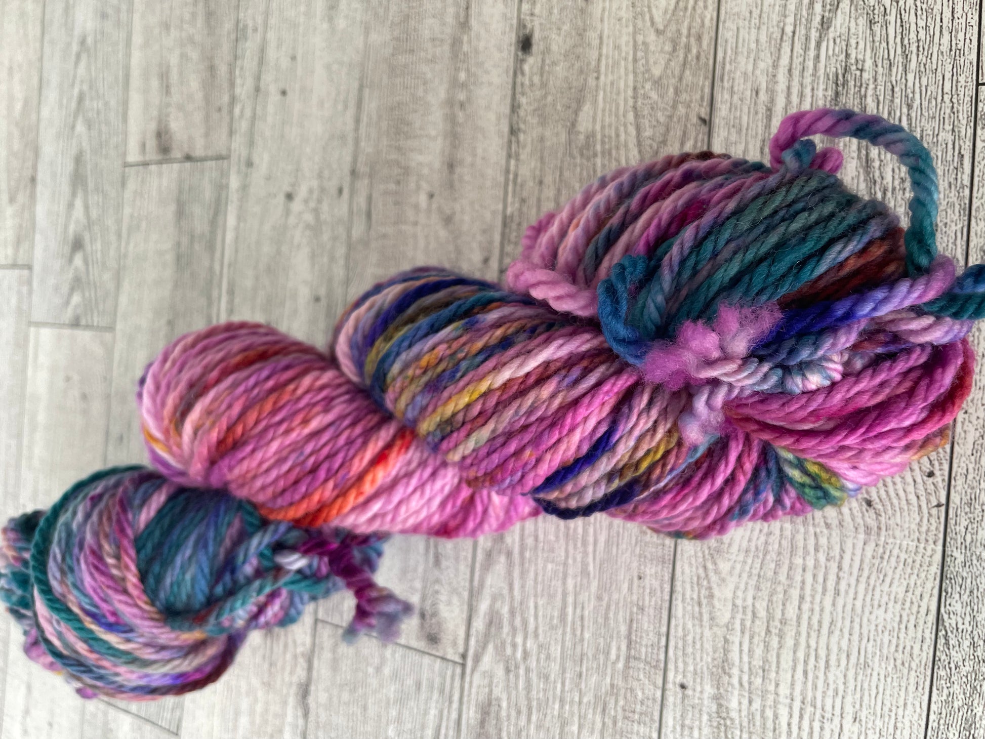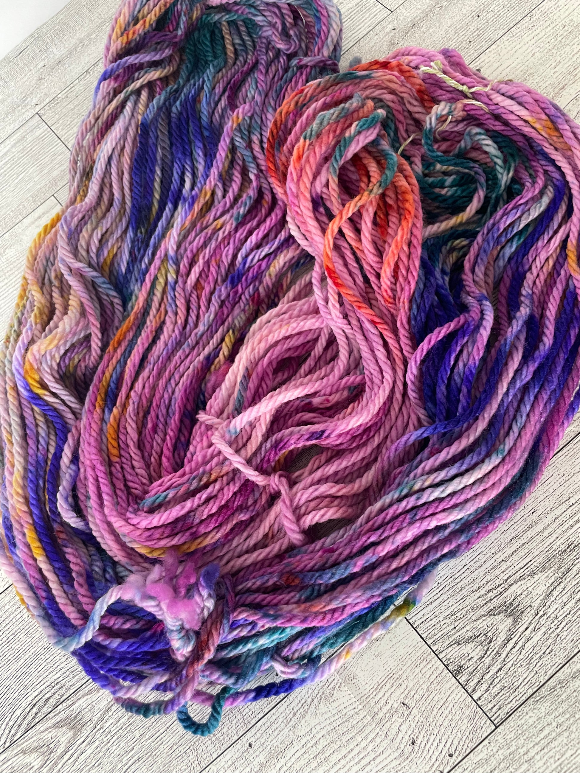 La Familia Madrigal is so bright. It's dyed with a gorgeous berry color and splashes of pink, blue, teal, gold and orange.
