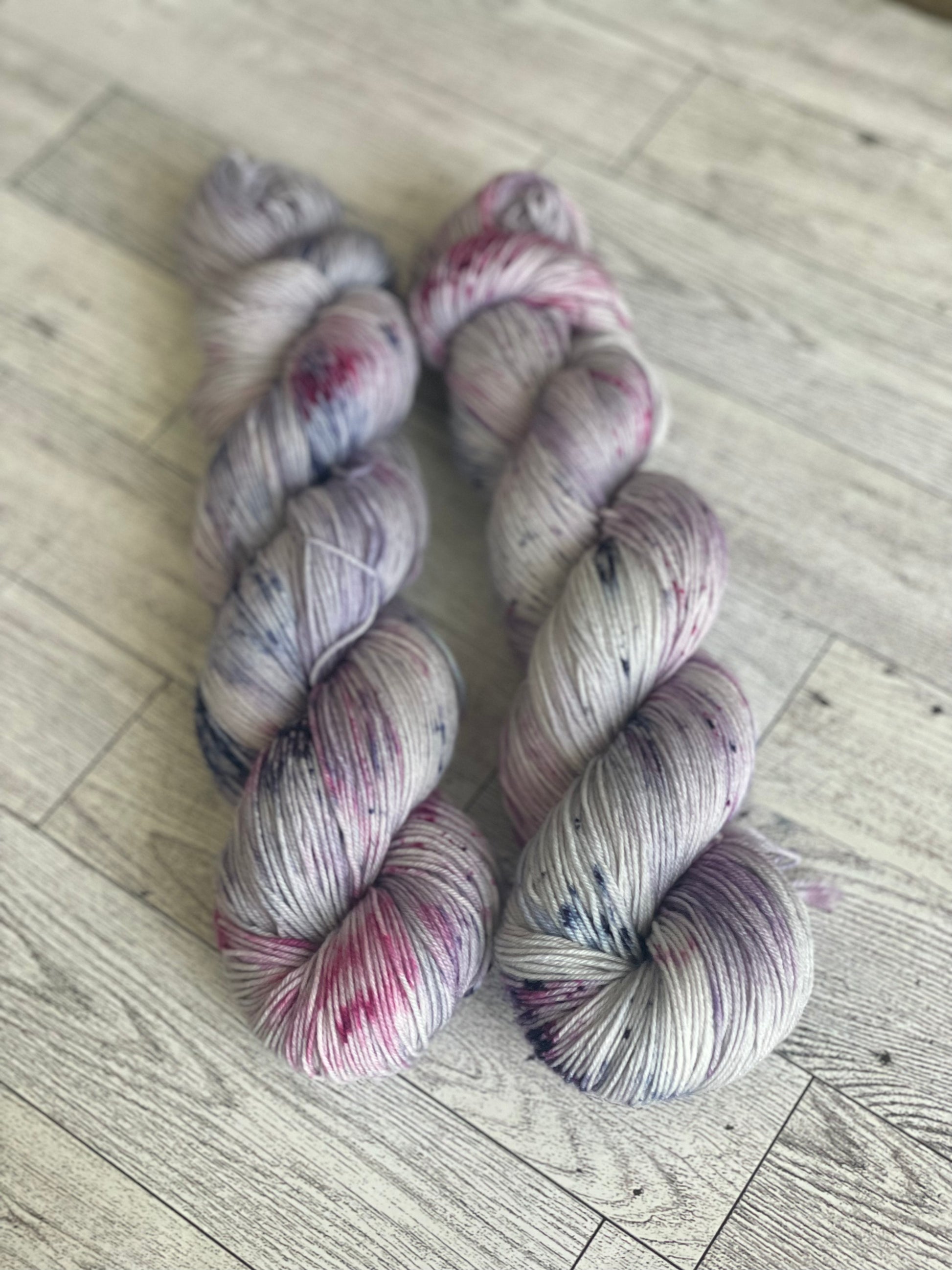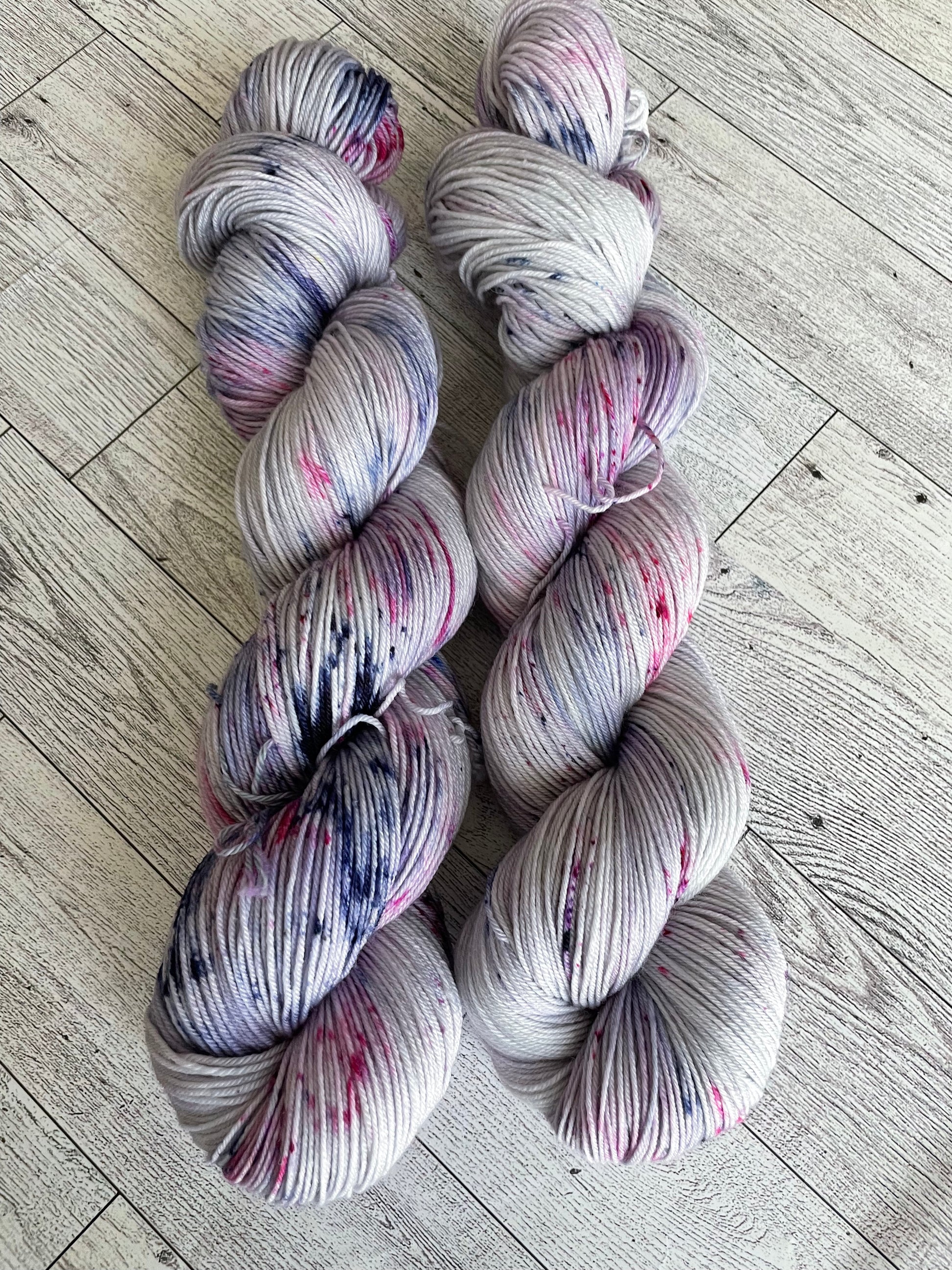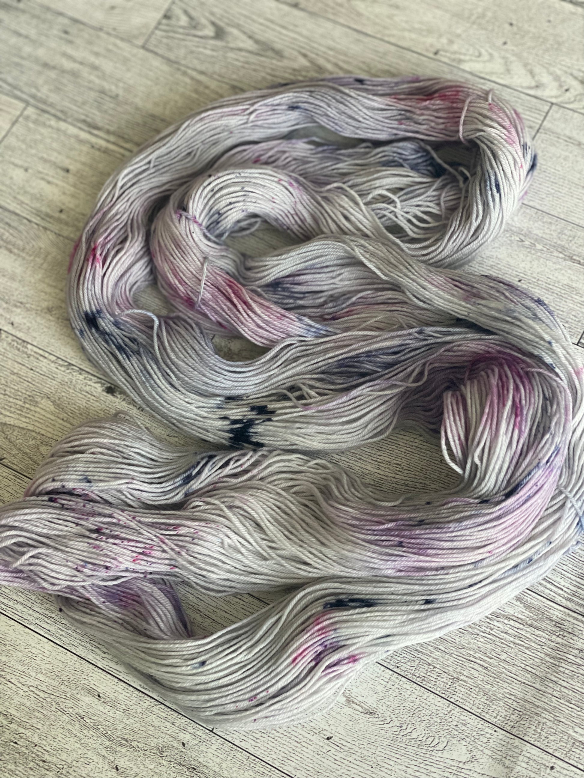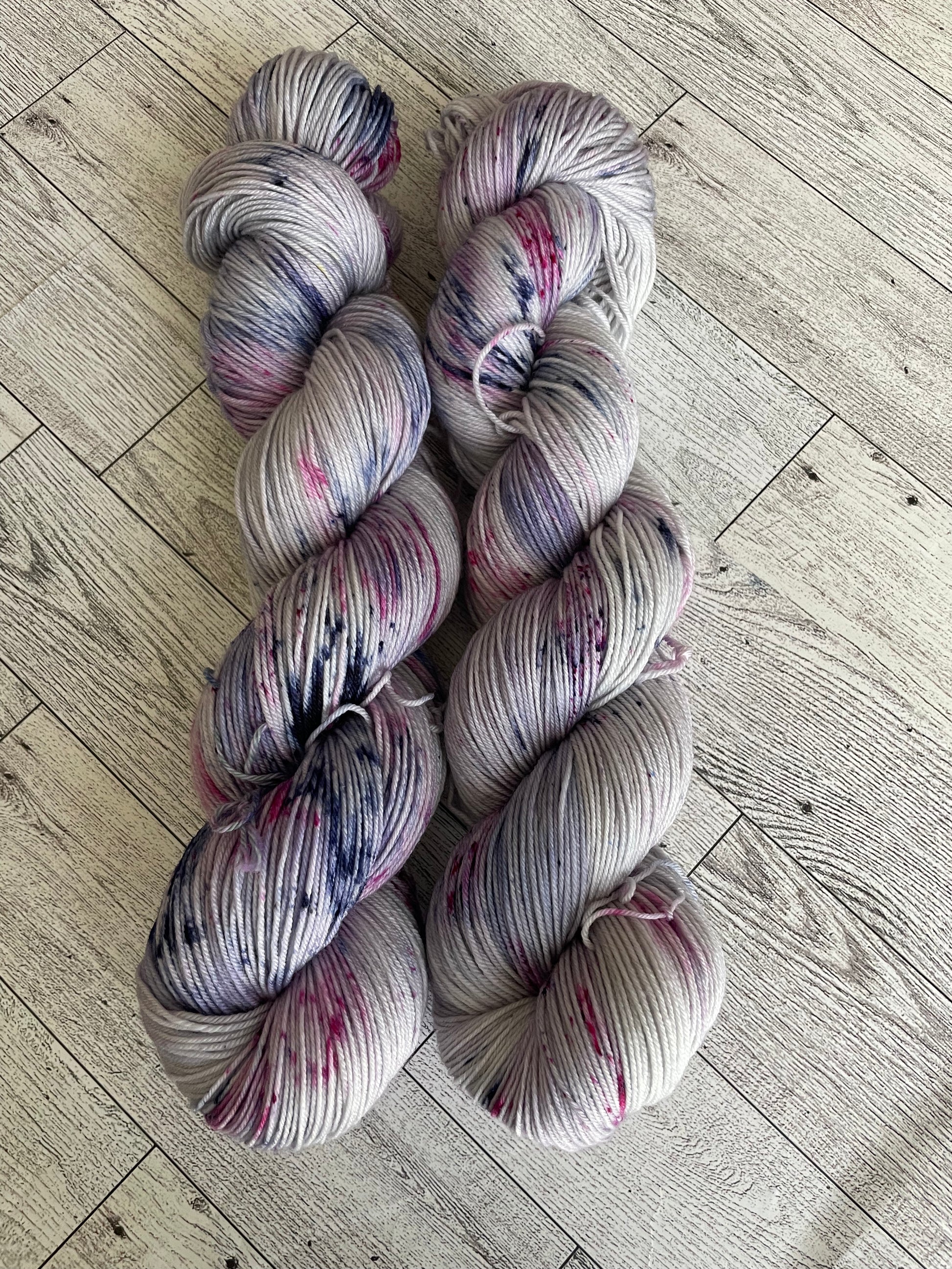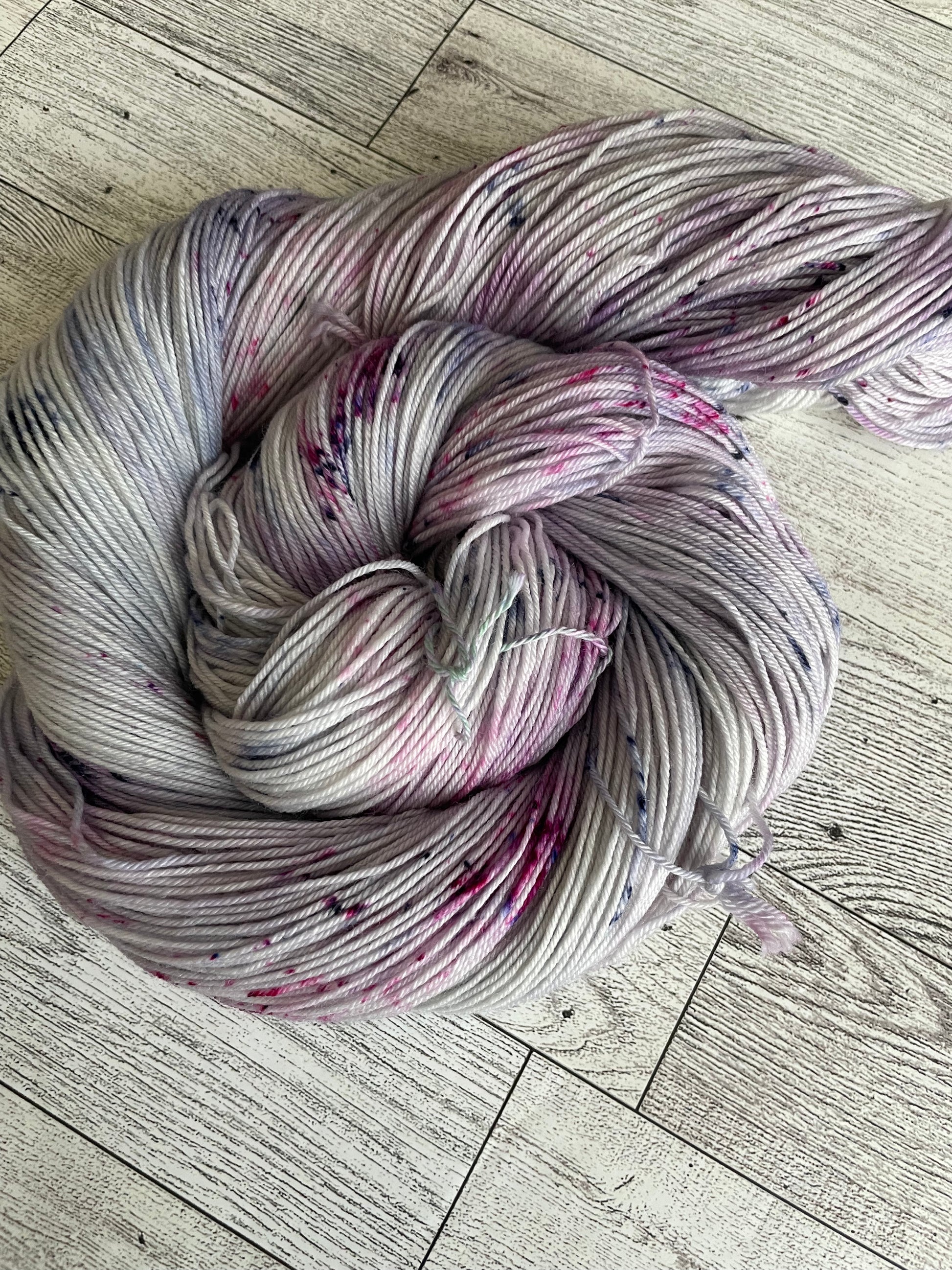 Lady Grey is a light grey yarn speckled with pink and navy.