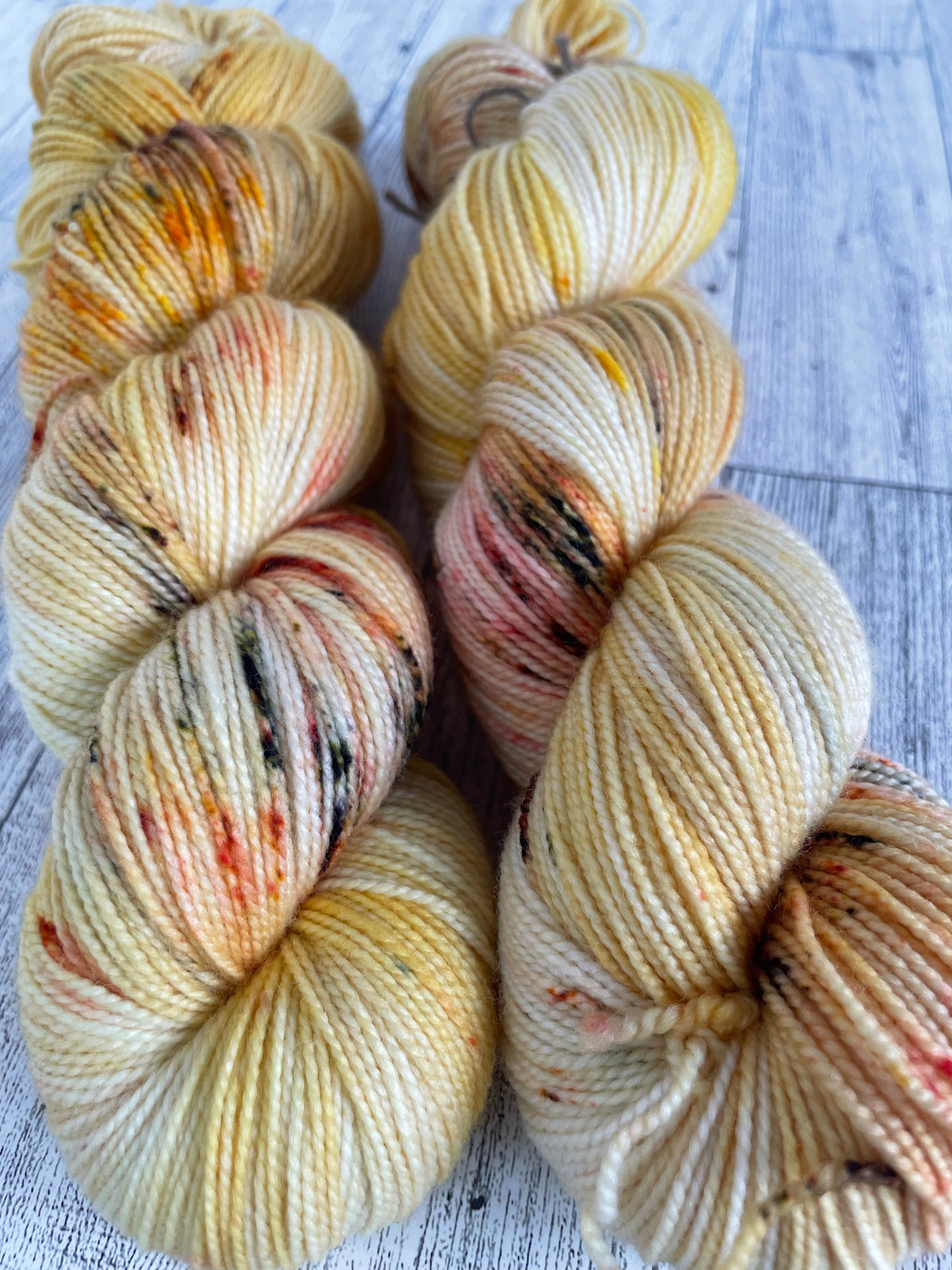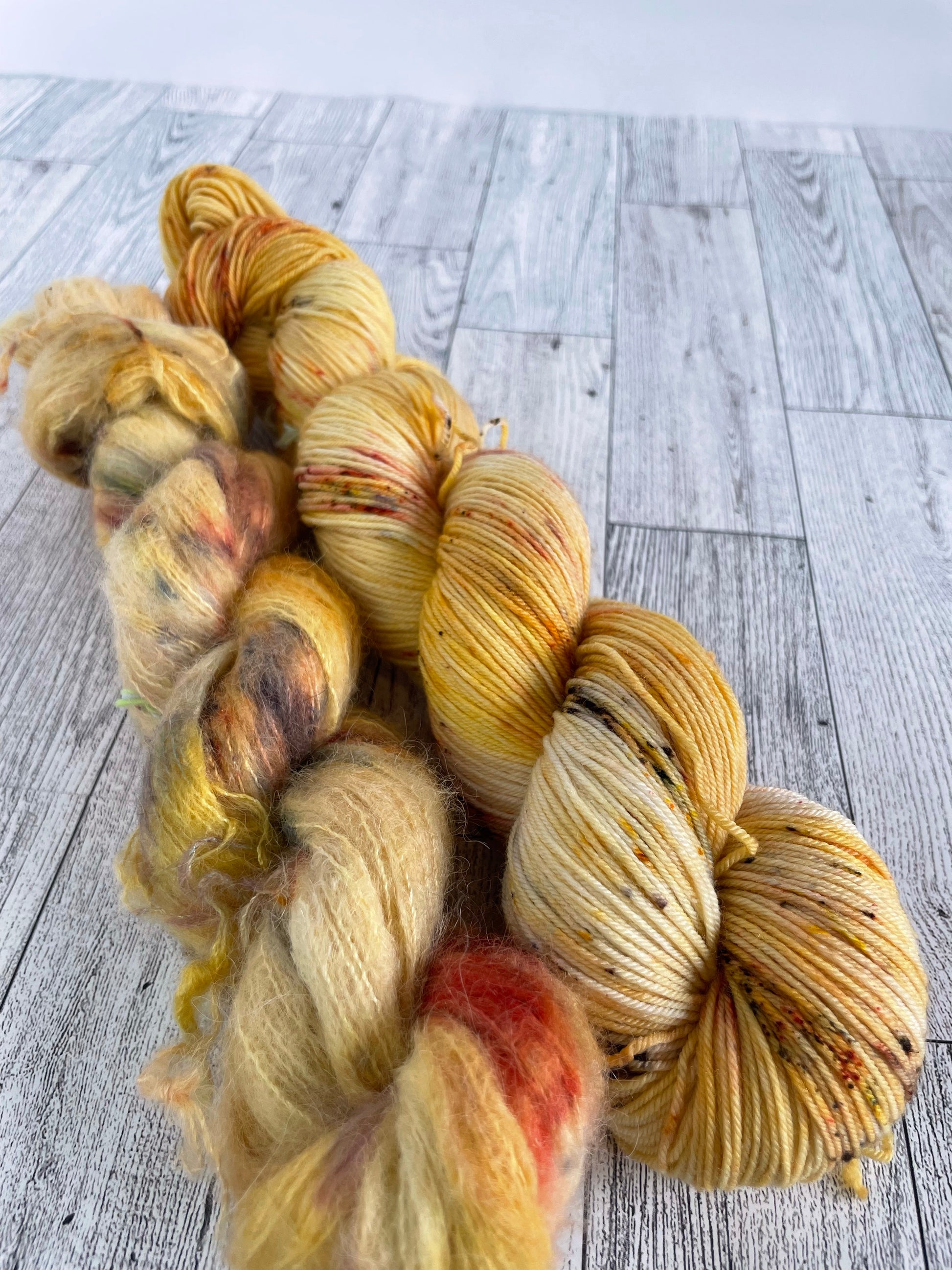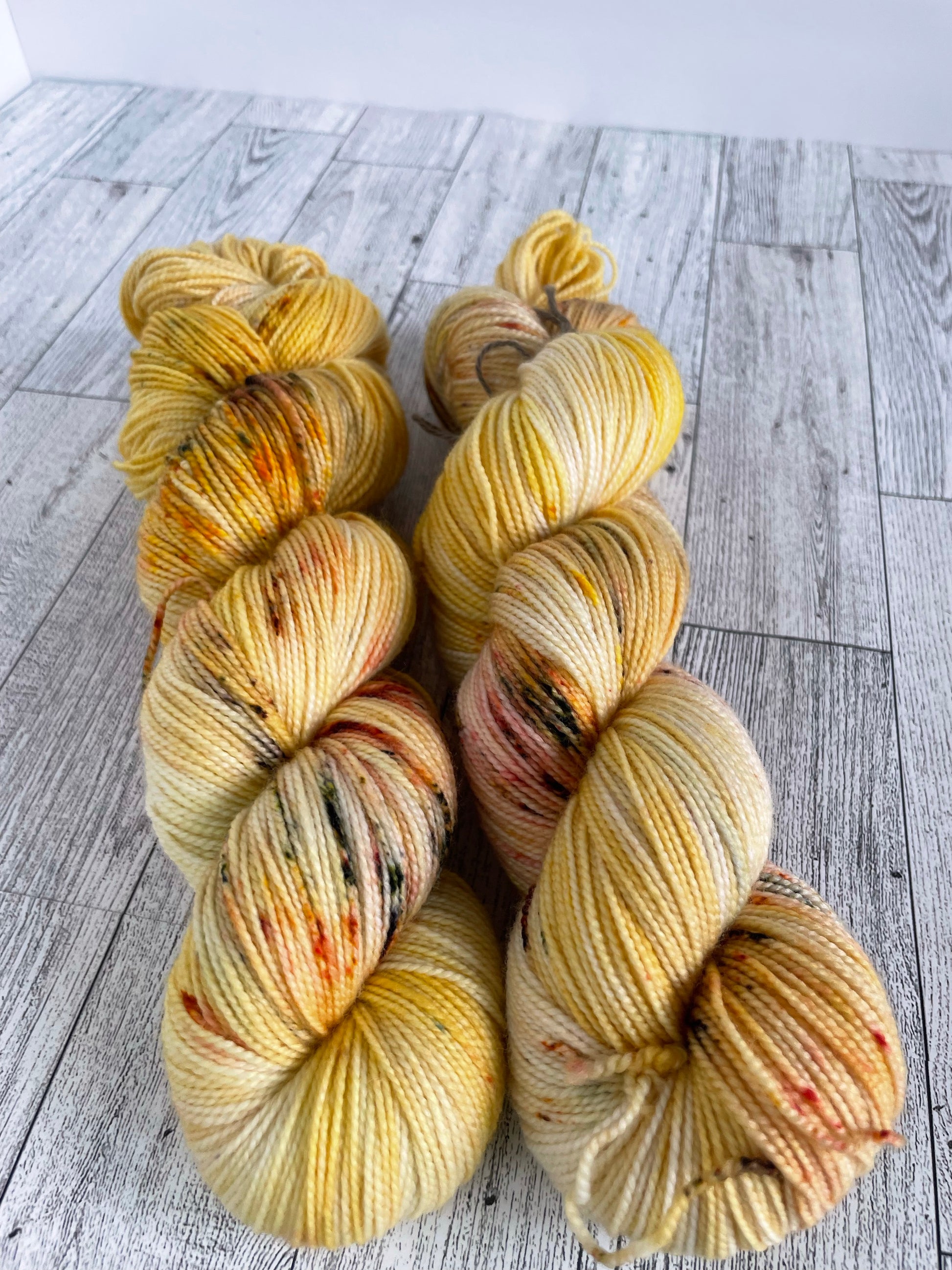 Mabel from our Murder Mystery Collection is dyed a golden yellow with a speckling of red, green, gold and brown.