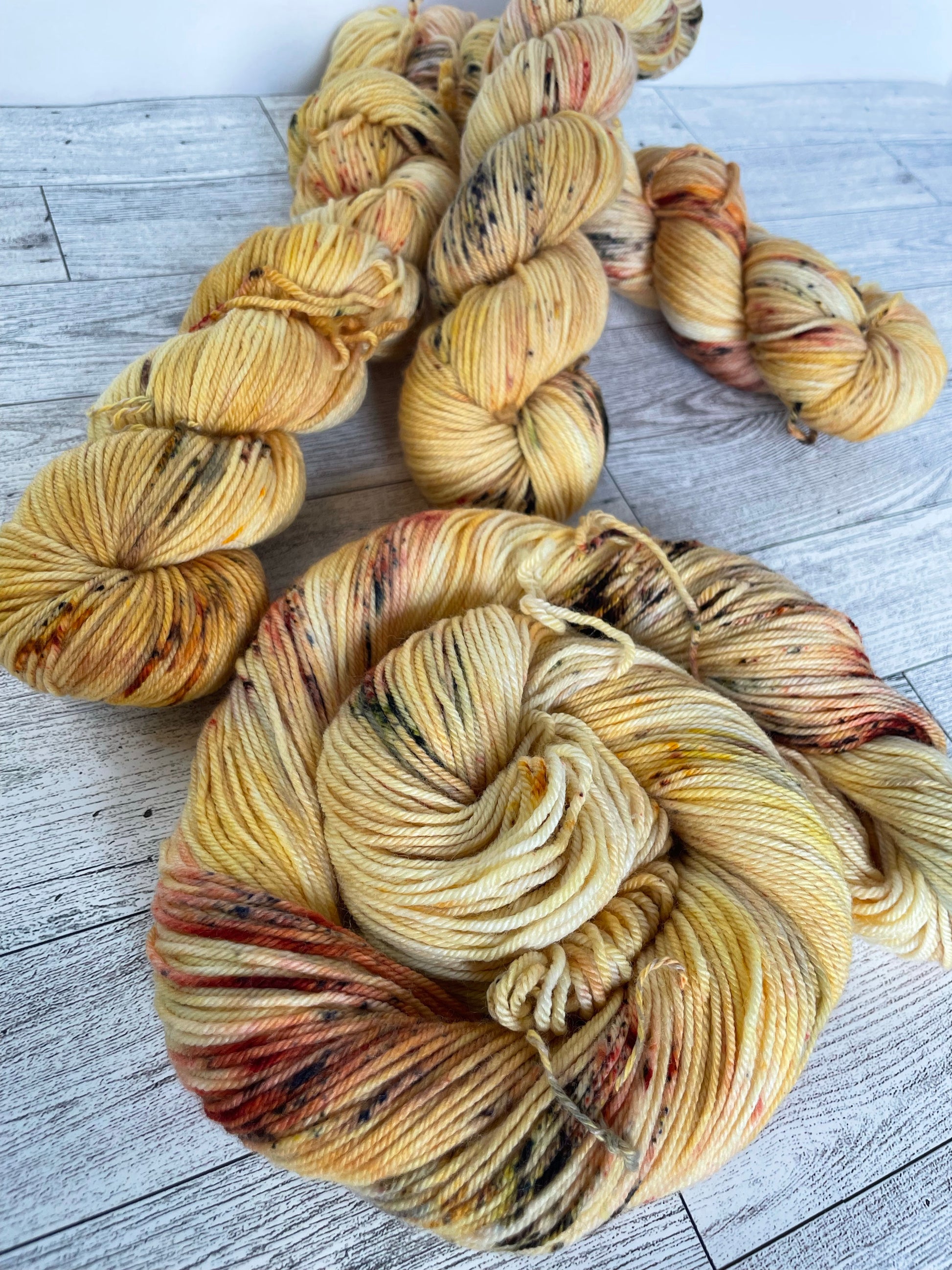 Mabel from our Murder Mystery Collection is dyed a golden yellow with a speckling of red, green, gold and brown.