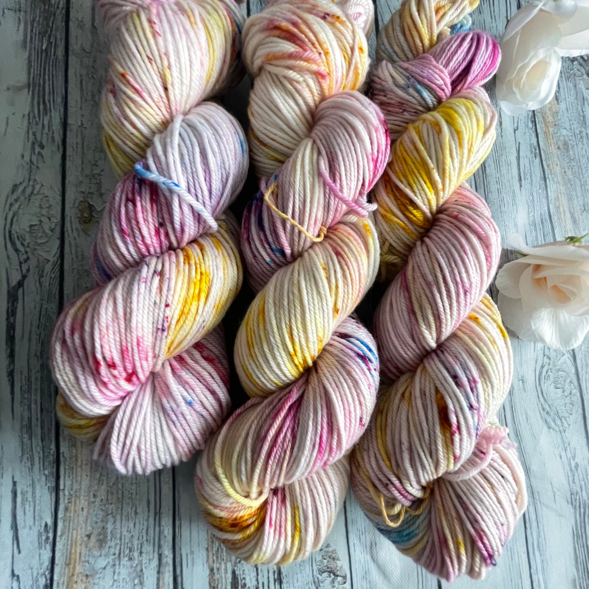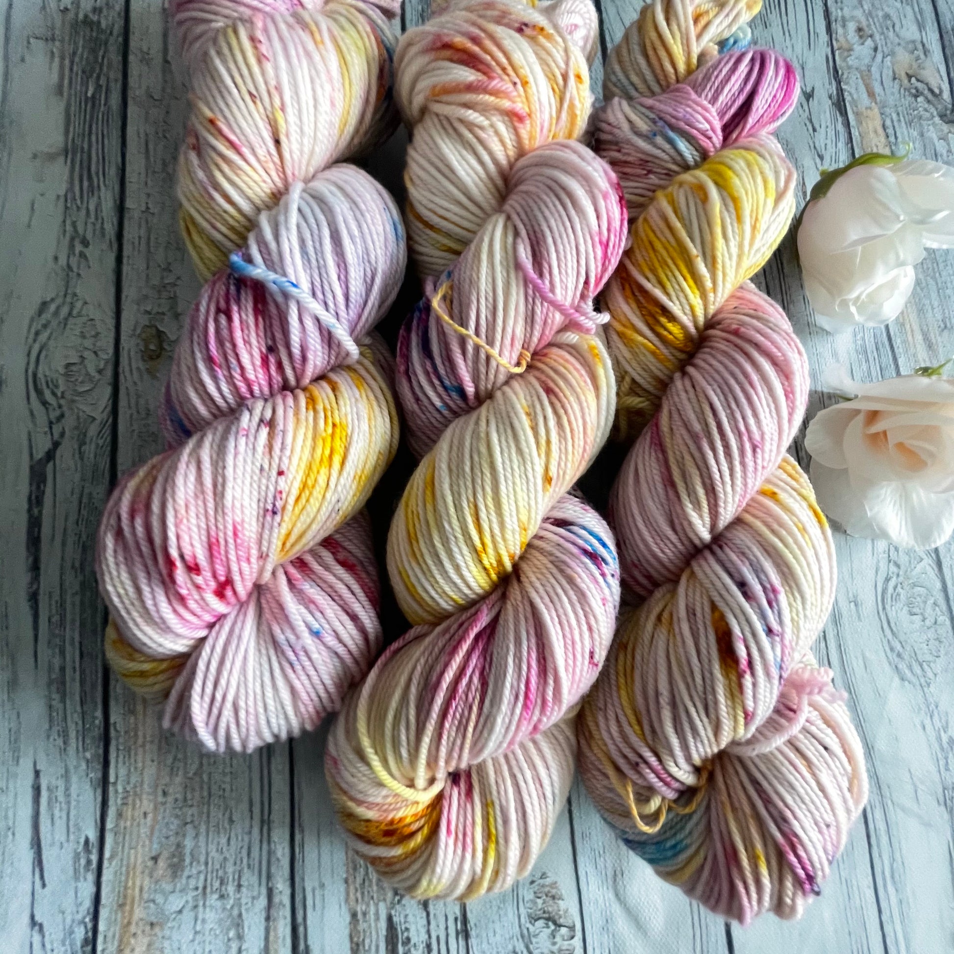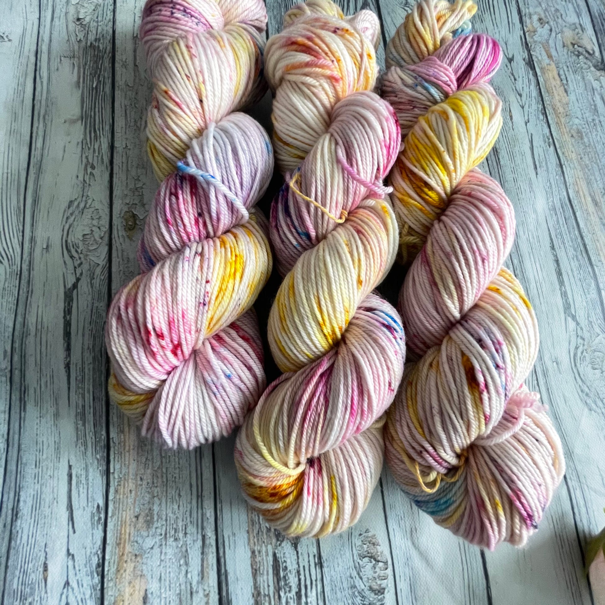 Mamacita is dyed with a speckling of gold, various pinks, and blue.