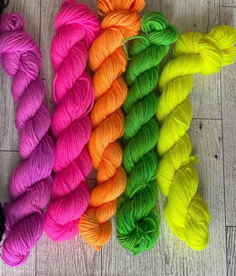The Neon Mini set includes five 20 gram mini skeins. The mini skeins in this set are Wowza, Green Bomb, Bright Orange, Knockout and Purple Panic.
