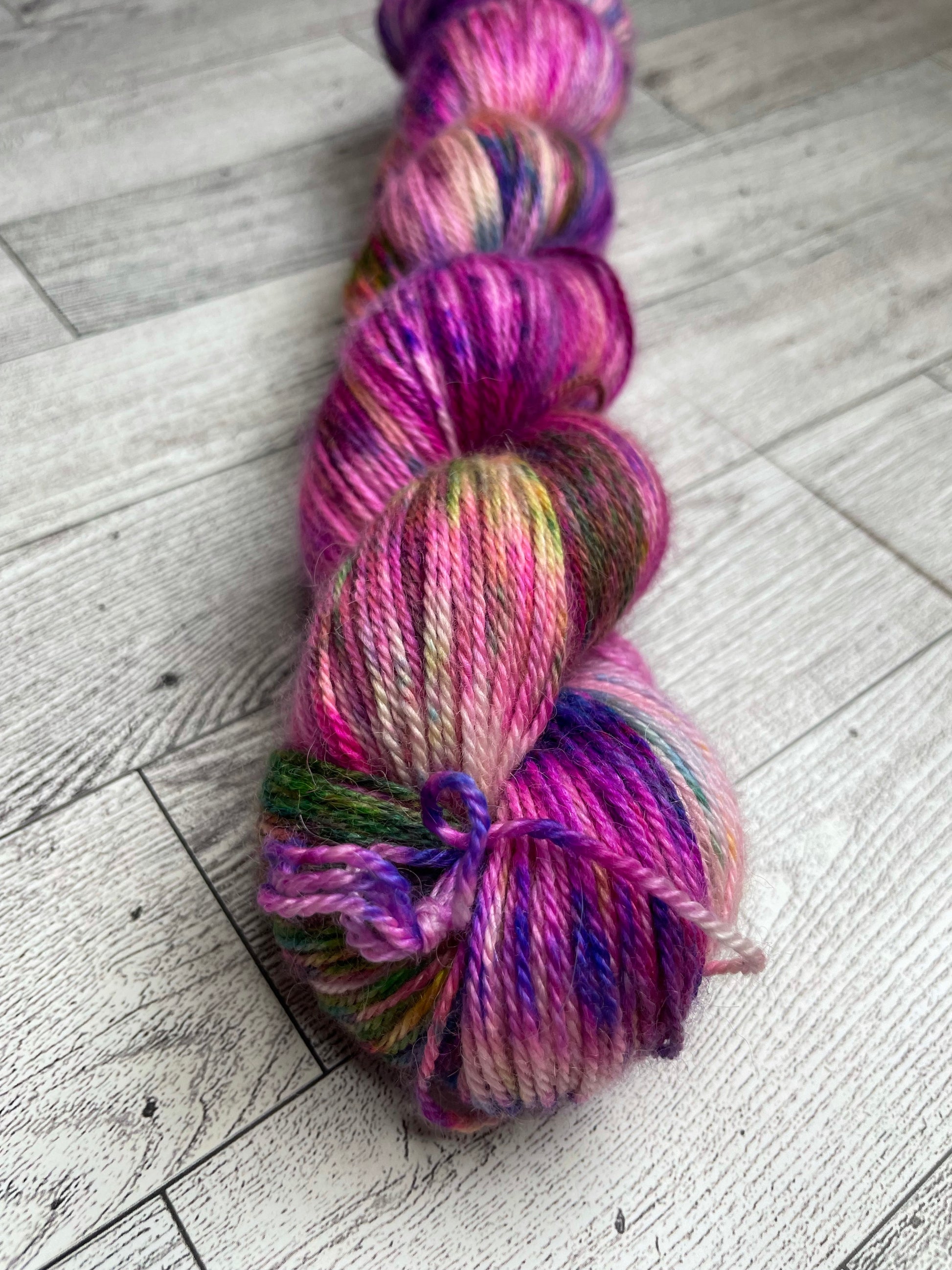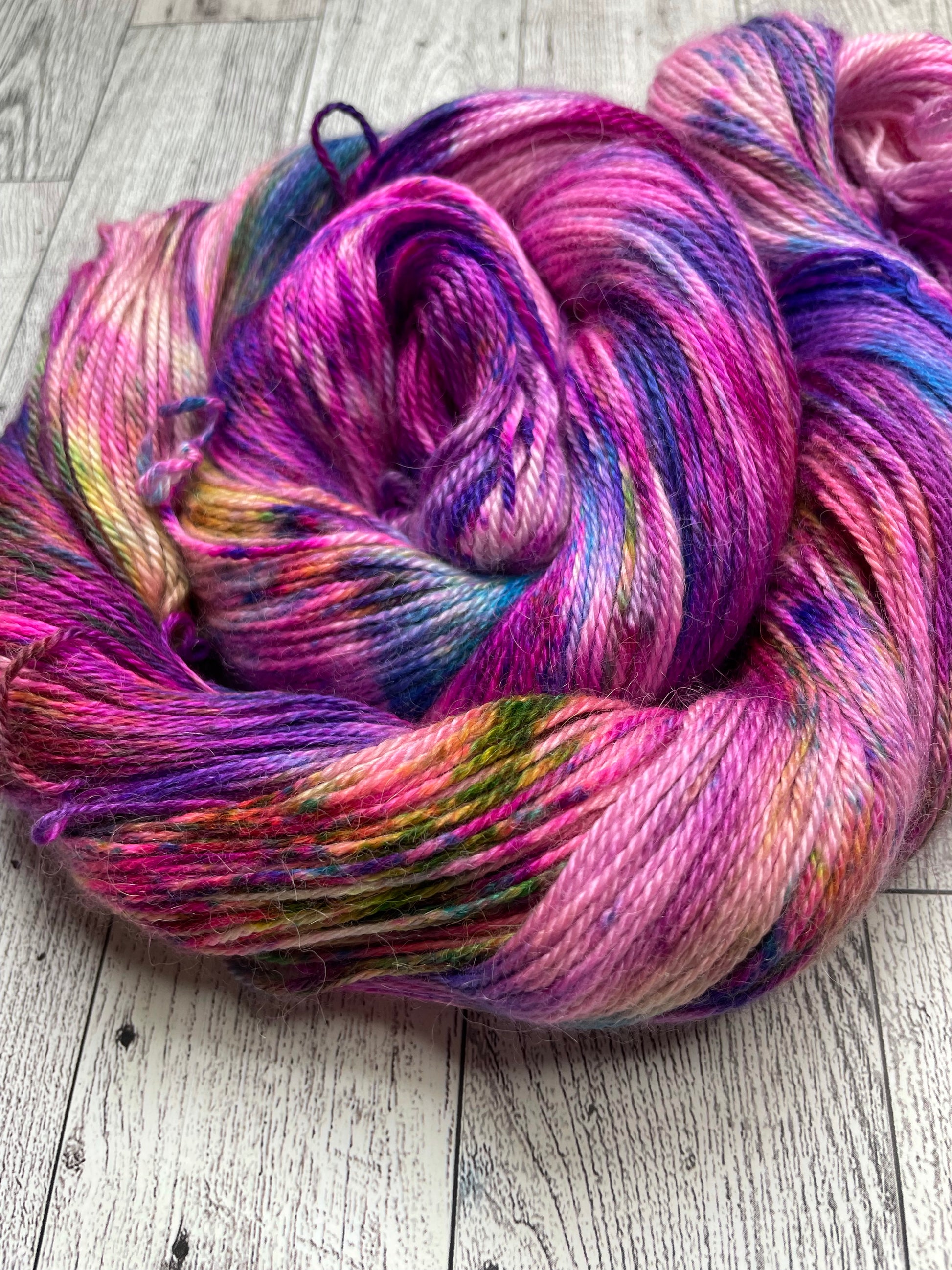 Pink Lady is dyed pink with a speckling of blue, green, purple and yellow.