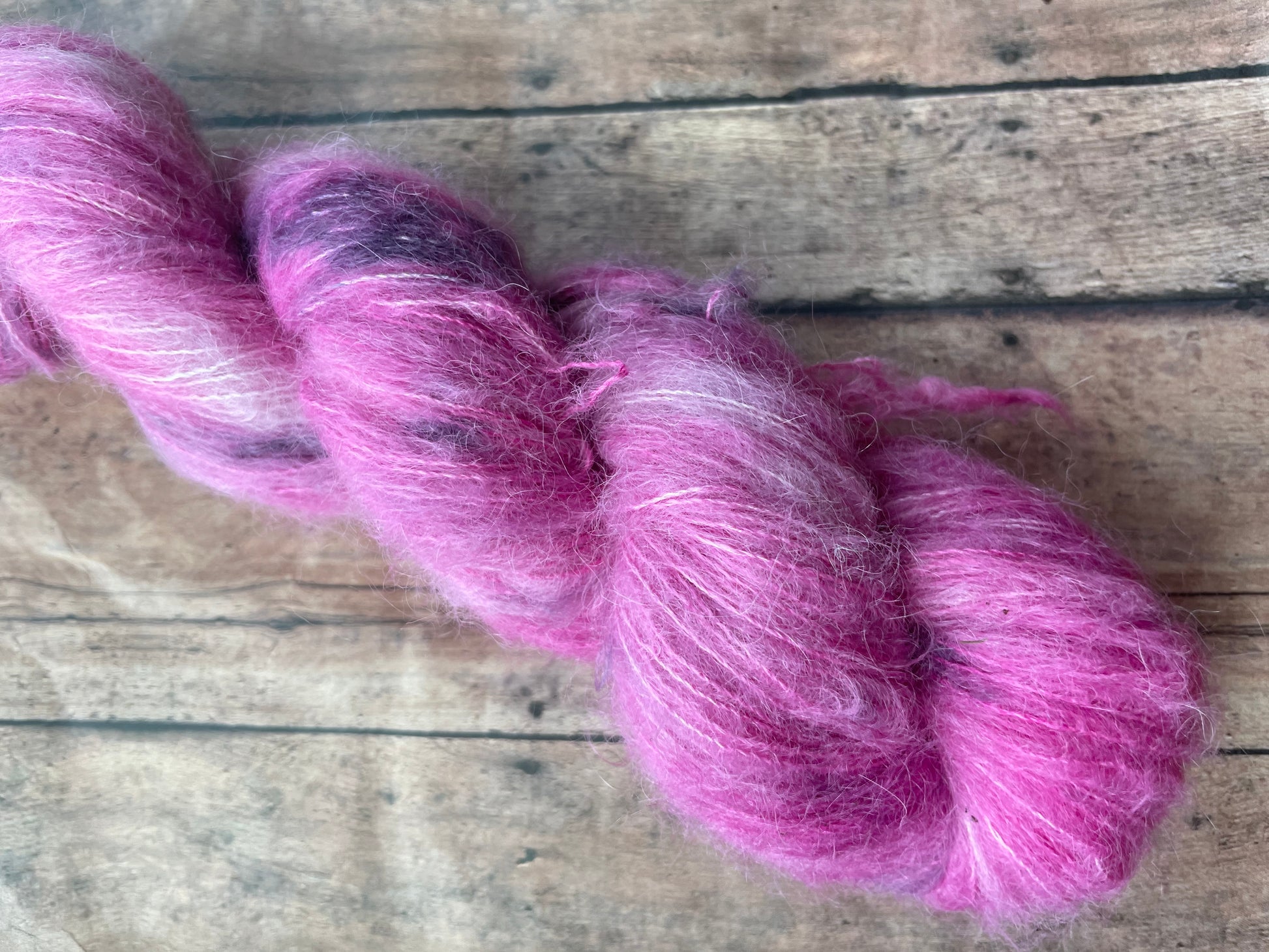 Rambunctious is dyed a beautiful pink with black speckles.
