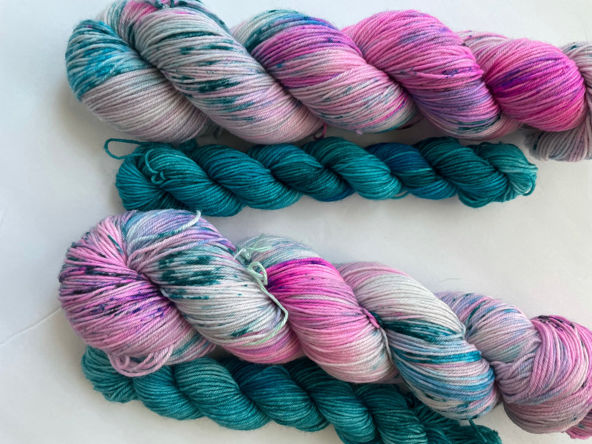 One Skein of Rockaway sock yarn with a Lagoon mini skein.
