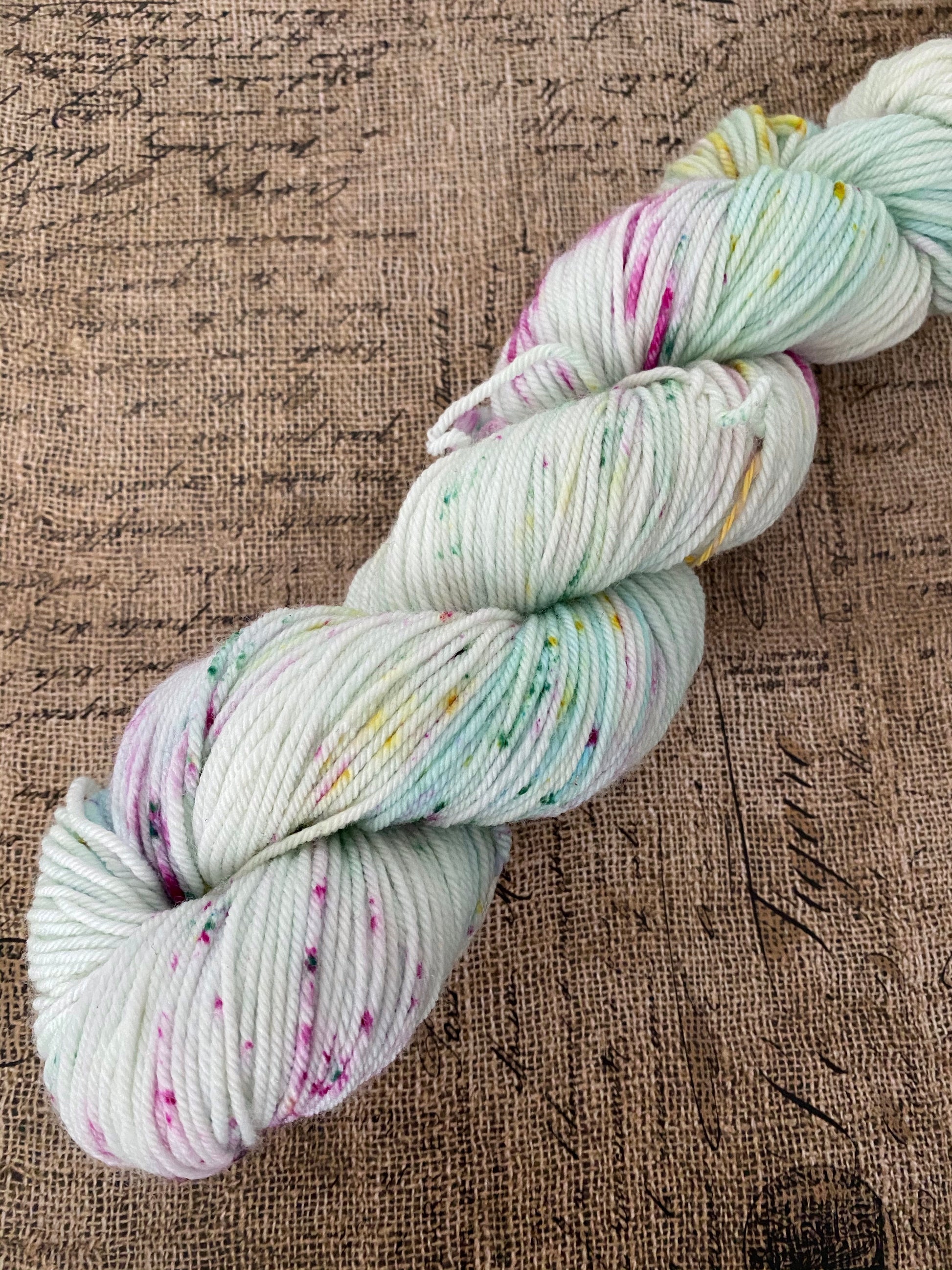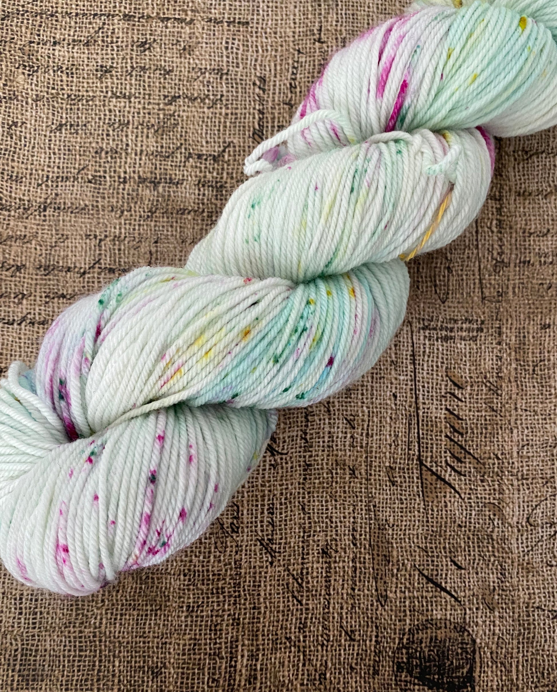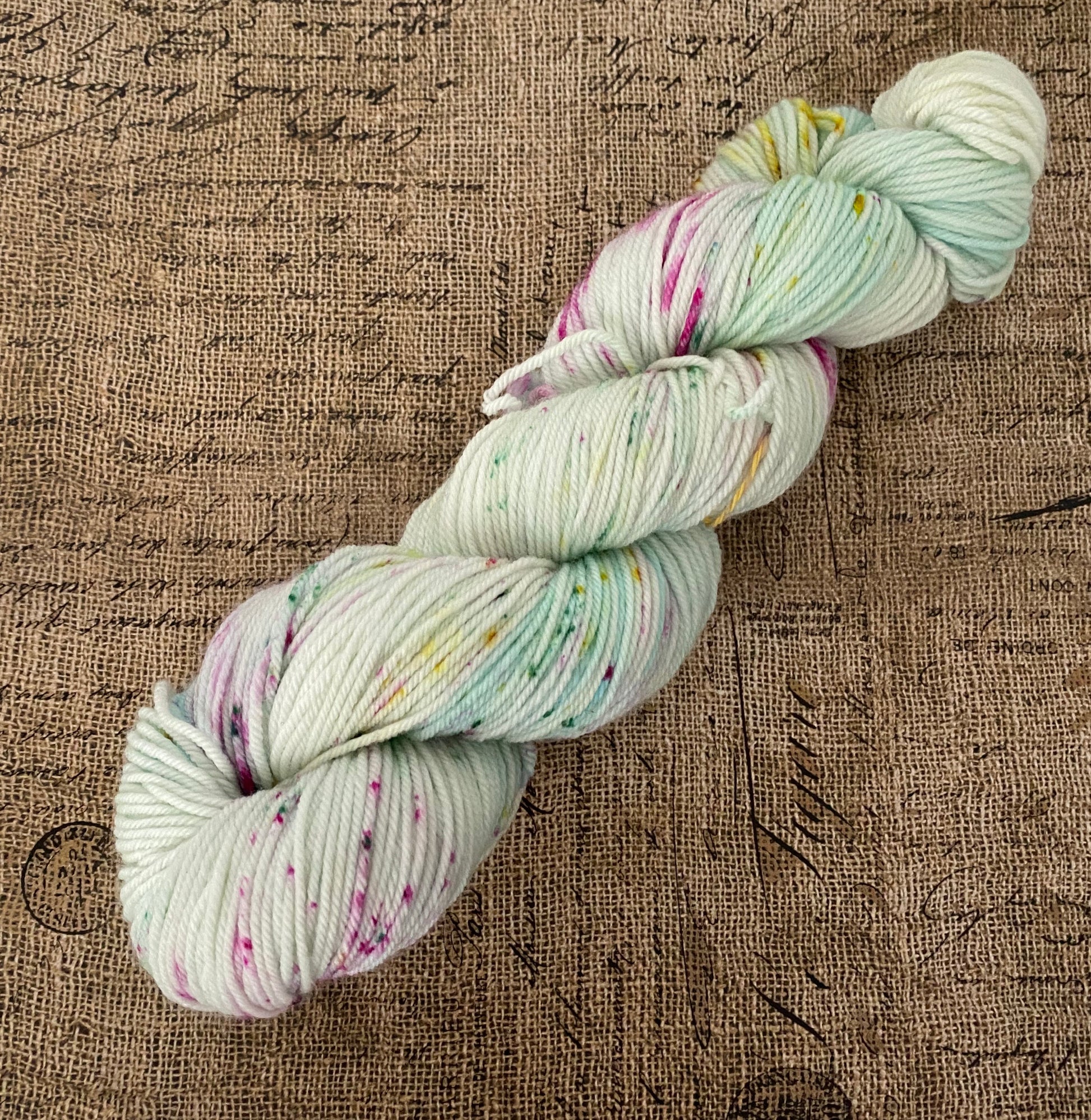 Santa Baby is dyed a pale aqua with a speckling of pink, green and gold.
