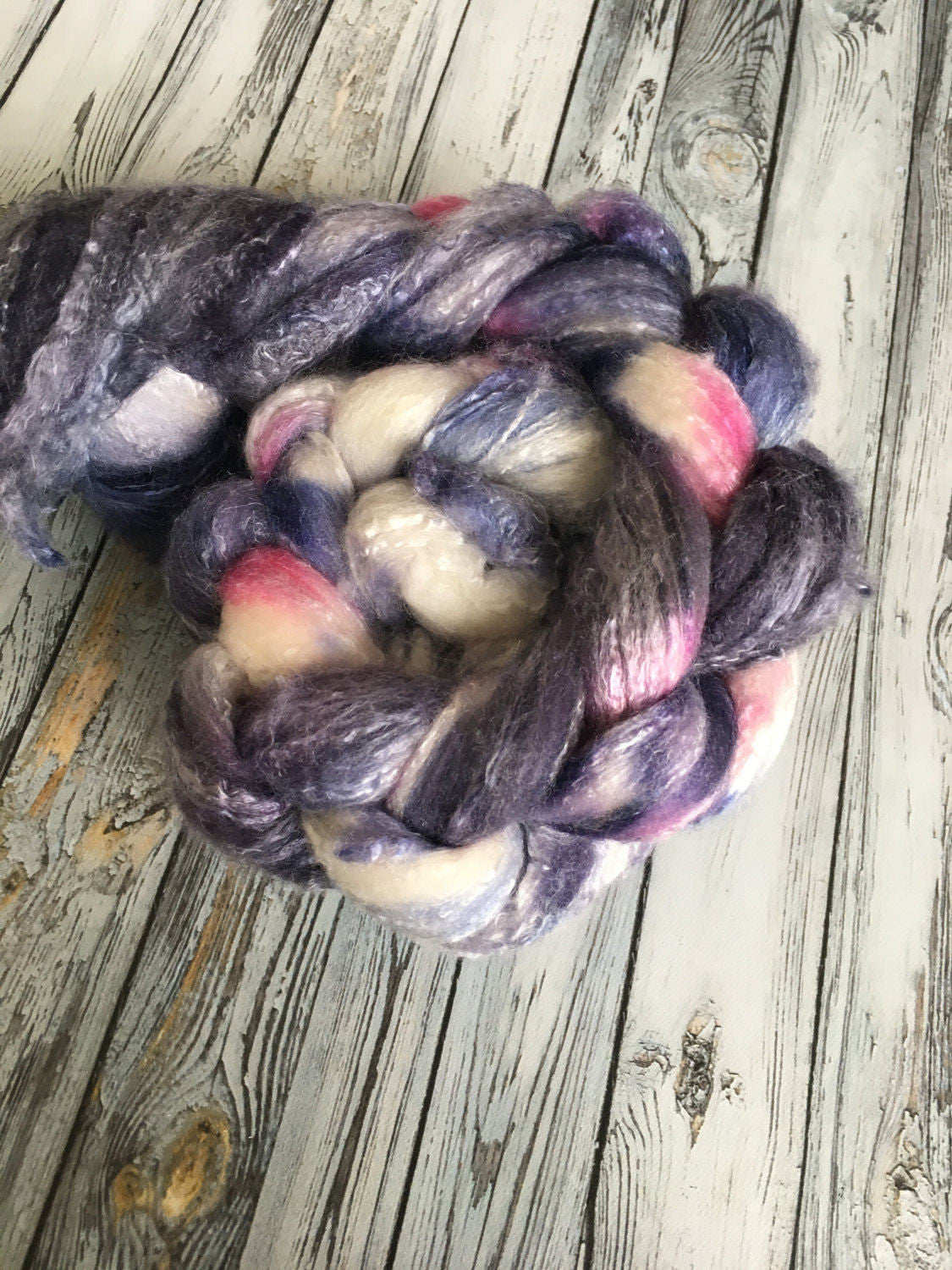 This listing is for a 4 oz braid of Cosmo dyed on this beautifully blended fibre. Hand dyed using navy and raspberry to create this braid.