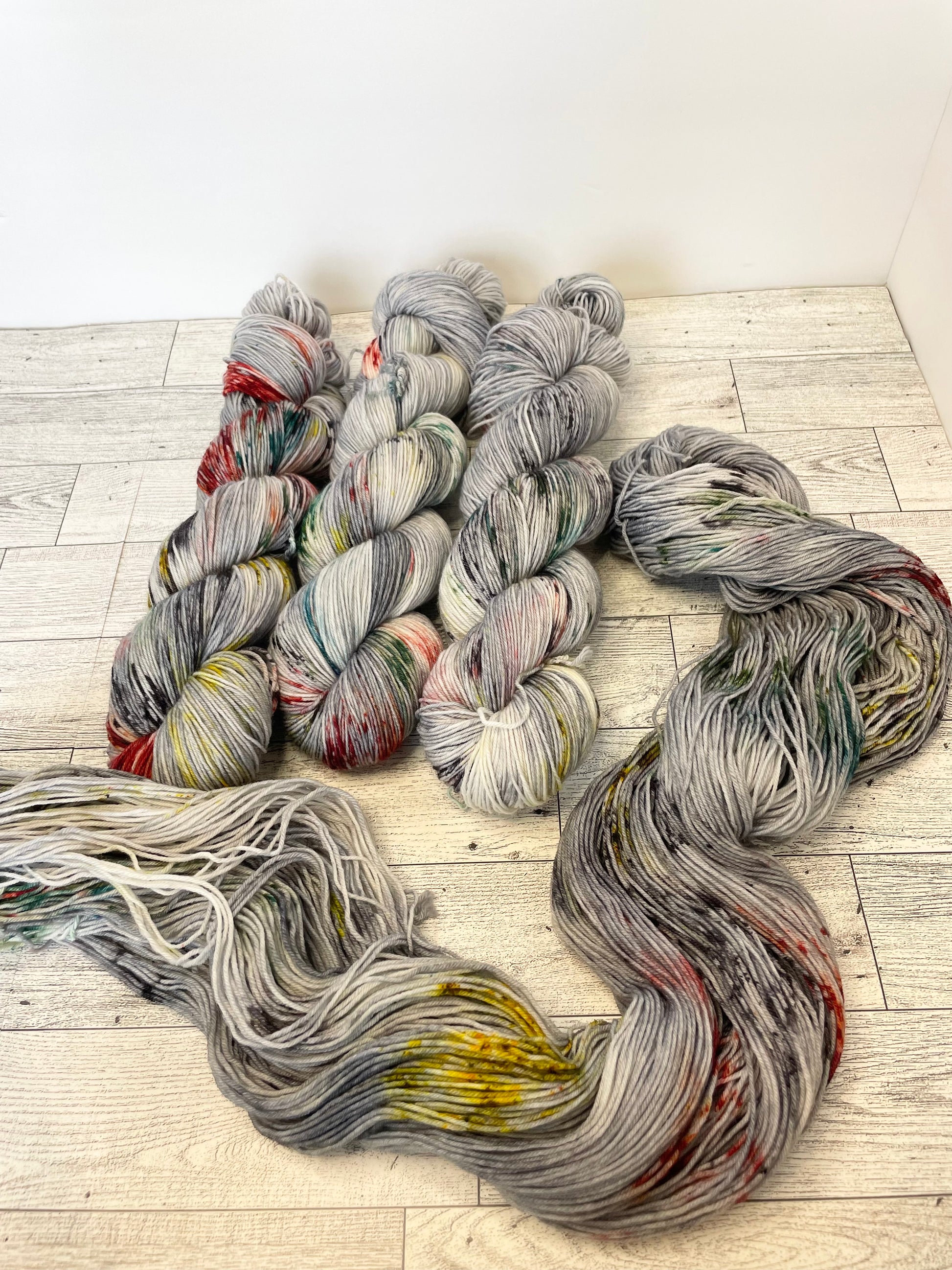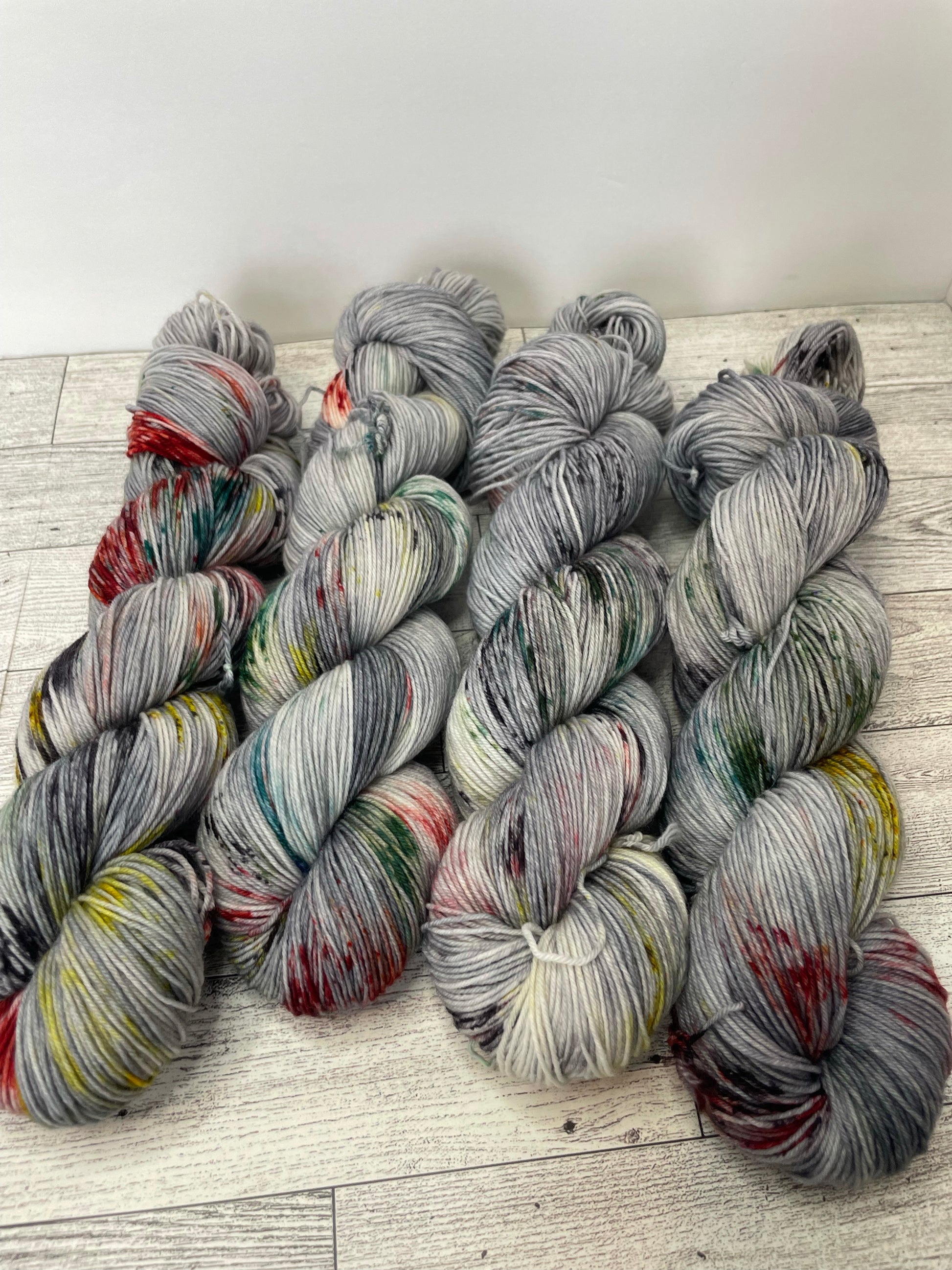 Who Killed Tim from our Murder Mystery Collection is dyed a grey with a speckling of red, various greens, black and gold.