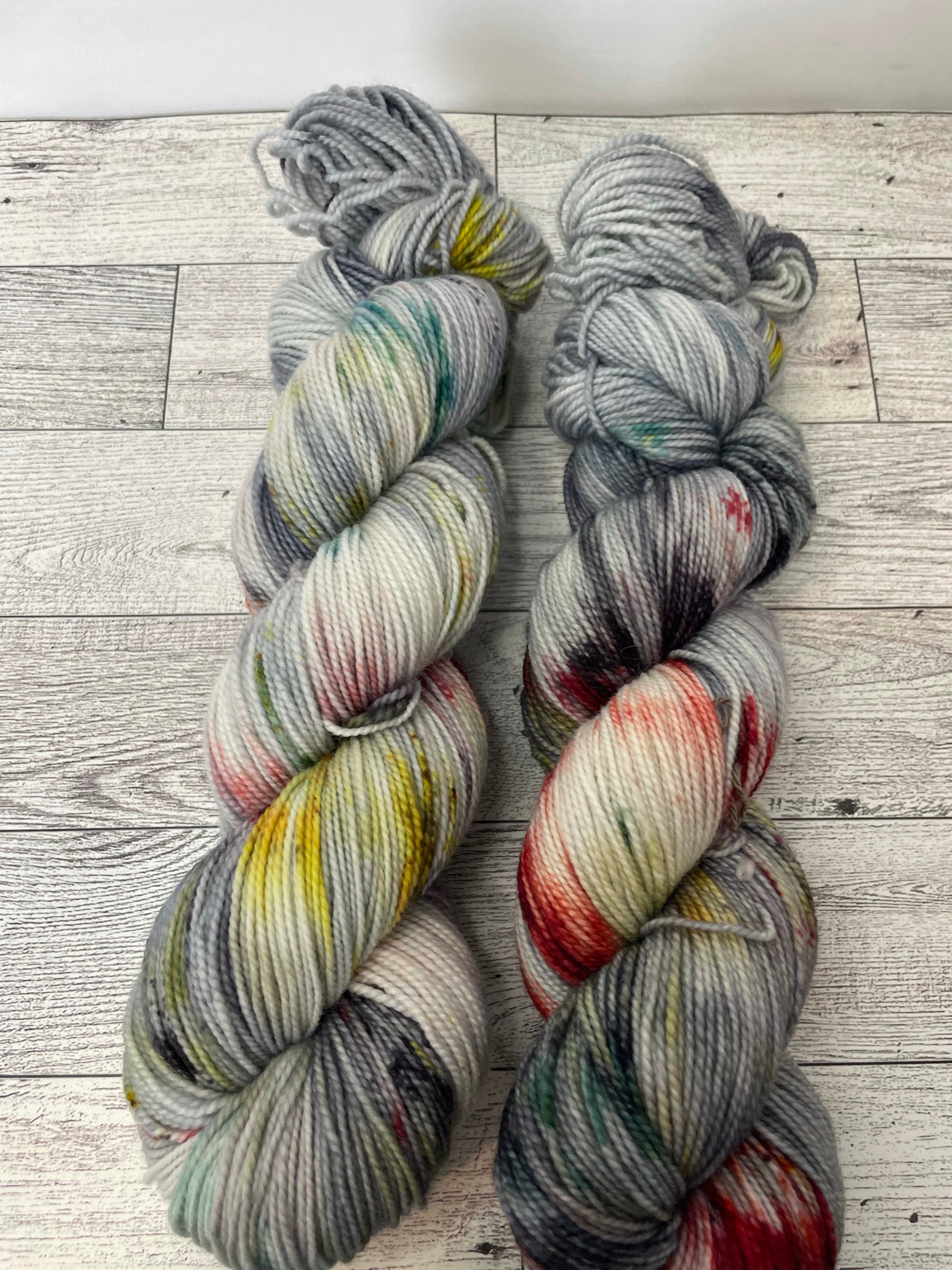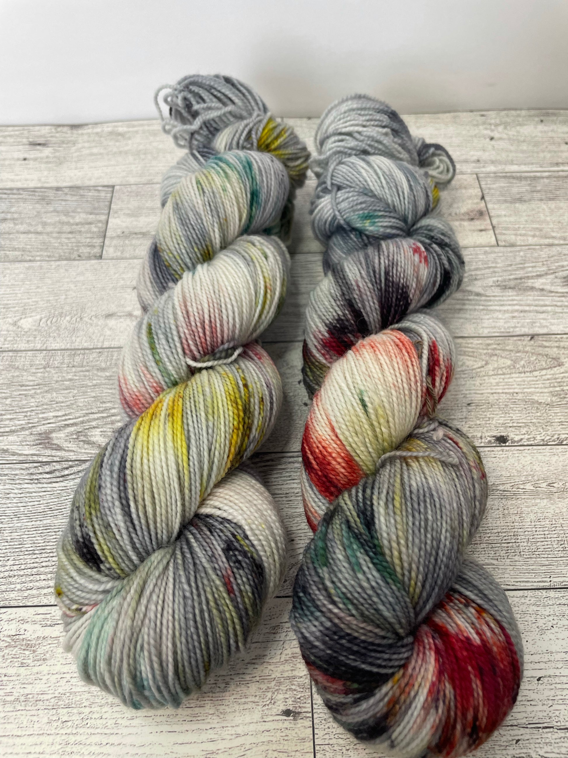 Who Killed Tim from our Murder Mystery Collection is dyed a grey with a speckling of red, various greens, black and gold.